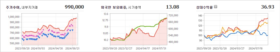삼성바이오로직스의 현재 주가는 990,000원입니다. 전일 대비 원 이동한 모습입니다. 시가 총액은 74조6615억 원이며 발행 주식은 총 71,174,000주 입니다. 외국인이 보유한 비중은 13.08%입니다. 삼성바이오로직스 기업의 영업이익은 억 원을 달성했으며 배당 수익율은 % 입니다.