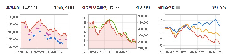 현재 NAVER의 주가는 156,400원으로, 전일 대비 3,900원이 하락했습니다. 주주 현황을 살펴보면 BlackRock Fund Advisors를 포함한 13명이 총 8.23%의 지분을 보유하고 있습니다. NAVER는 인터넷 서비스 기업으로, 현재 주가는 156,400원입니다. 회사의 시가 총액은 25조 5,469억 원이며, 발행된 주식 수는 160,784,508주입니다. 외국인 보유 비중은 42.99%이며, 장중 거래량은 1,035,007주에 달했습니다. NAVER의 매출액은 25,261억 원에 이릅니다.