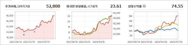 현대로템의 현재 주가는 52,800원으로, 전일 대비 변동이 없었습니다. 주주 현황을 살펴보면 현대자동차와 그 외 3인이 총 33.77%의 지분을 보유하고 있습니다. 현대로템은 운송 인프라 기업으로, 현재 주가는 52,800원입니다. 이 회사의 시가 총액은 5조 9,592억 원이며, 발행된 주식 수는 109,142,293주입니다. 외국인 보유 비중은 23.61%로, 장중 거래량은 8,114,979주에 달했습니다. 또한, 현대로템의 매출액은 7,478억 원에 이릅니다.