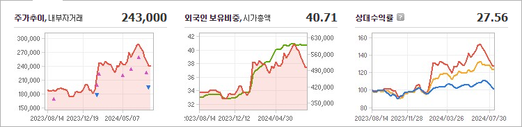 현대차의 현재 주가는 243,000원으로, 전일 대비 500원이 하락했습니다. 주주 현황을 살펴보면 현대모비스와 기타 10인이 총 29.98%의 지분을 보유하고 있습니다. 현대차는 자동차 제조업체로서 장중 기준으로 주가는 243,000원입니다. 현대차의 시가총액은 50조4693억 원이며, 총 발행 주식 수는 209,416,191주입니다. 외국인의 보유 비율은 40.71%이며, 장중 거래량은 358,474주에 달했습니다. 또한, 현대차의 매출액은 406,585억 원에 이릅니다.