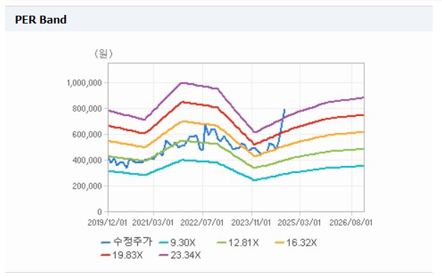 고려아연의 현재 주가는 794,000원입니다. 전일 대비 -15,000원 이동한 모습입니다. 시가 총액은 17조595억 원이며 발행 주식은 총 20,703,283주 입니다. 외국인이 보유한 비중은 16.86%입니다. 고려아연 기업의 영업이익은 억 원을 달성했으며 배당 수익율은 3.01% 입니다.