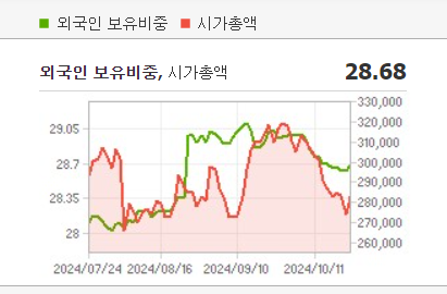 단기 포트폴리오를 구성하려면 시가 총액과 장중 거래량을 살펴봐야 합니다. POSCO홀딩스의 시가 총액은 28조510억 원이며 장중 거래량은 252,149원 을 기록했습니다. 대주주의 정보는 크게 중요하지 않지만 장기적인 관점에서는 확인해보는 것이 좋습니다.