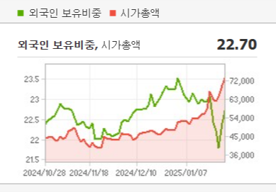 단기 포트폴리오를 구성하려면 시가 총액과 장중 거래량도 확인해야 합니다. LS ELECTRIC의 시가 총액은 7조3200억 원이며 장중 거래량은 1,073,939원 을 기록했습니다. 대주주의 정보는 중요하지 않을 수도 있으나 장기적인 관점에서는 확인이 필요합니다.