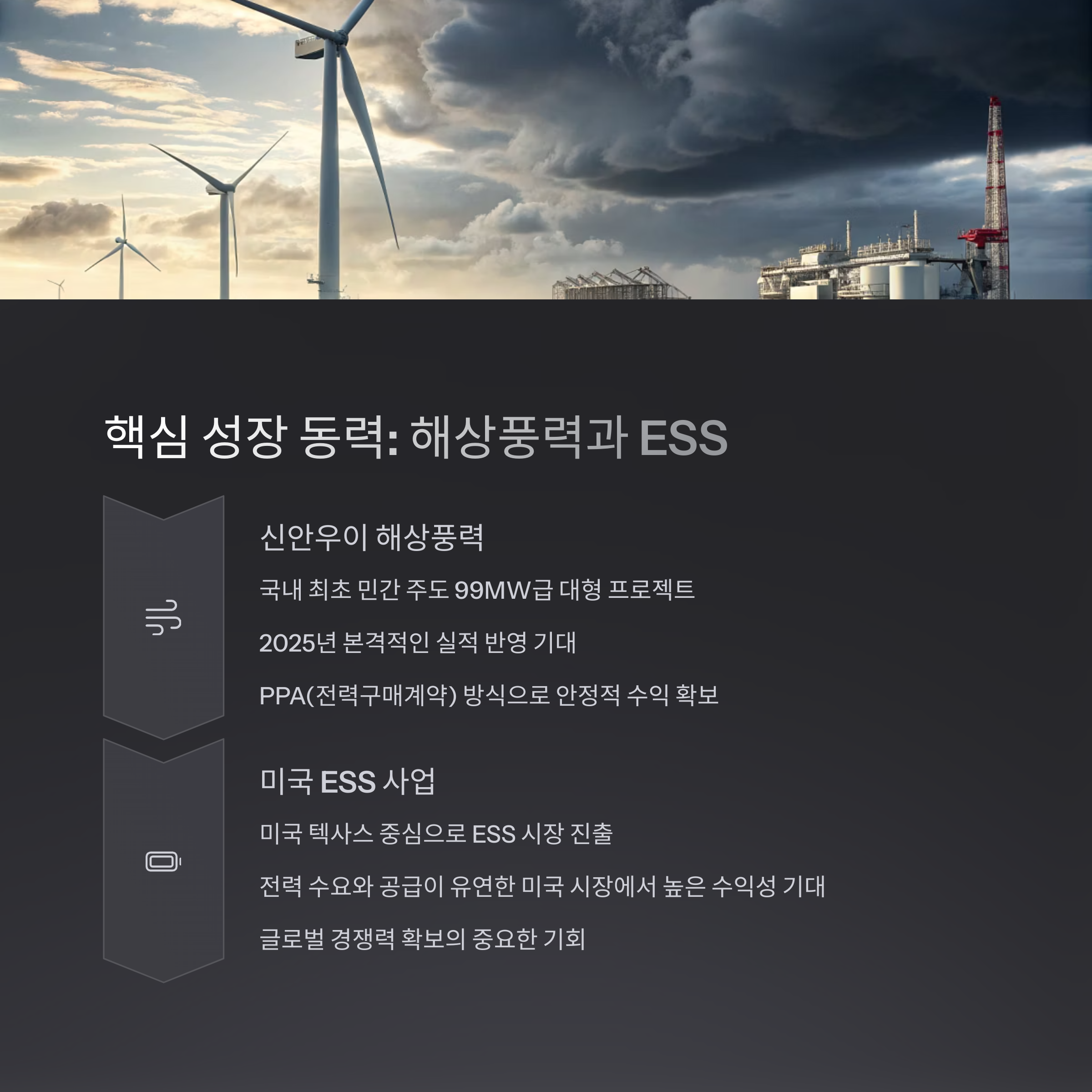 SK이터닉스의 핵심 성장 동력은 크게 두 가지입니다. 해상풍력 프로젝트와 미국 ESS 사업 진출입니다.