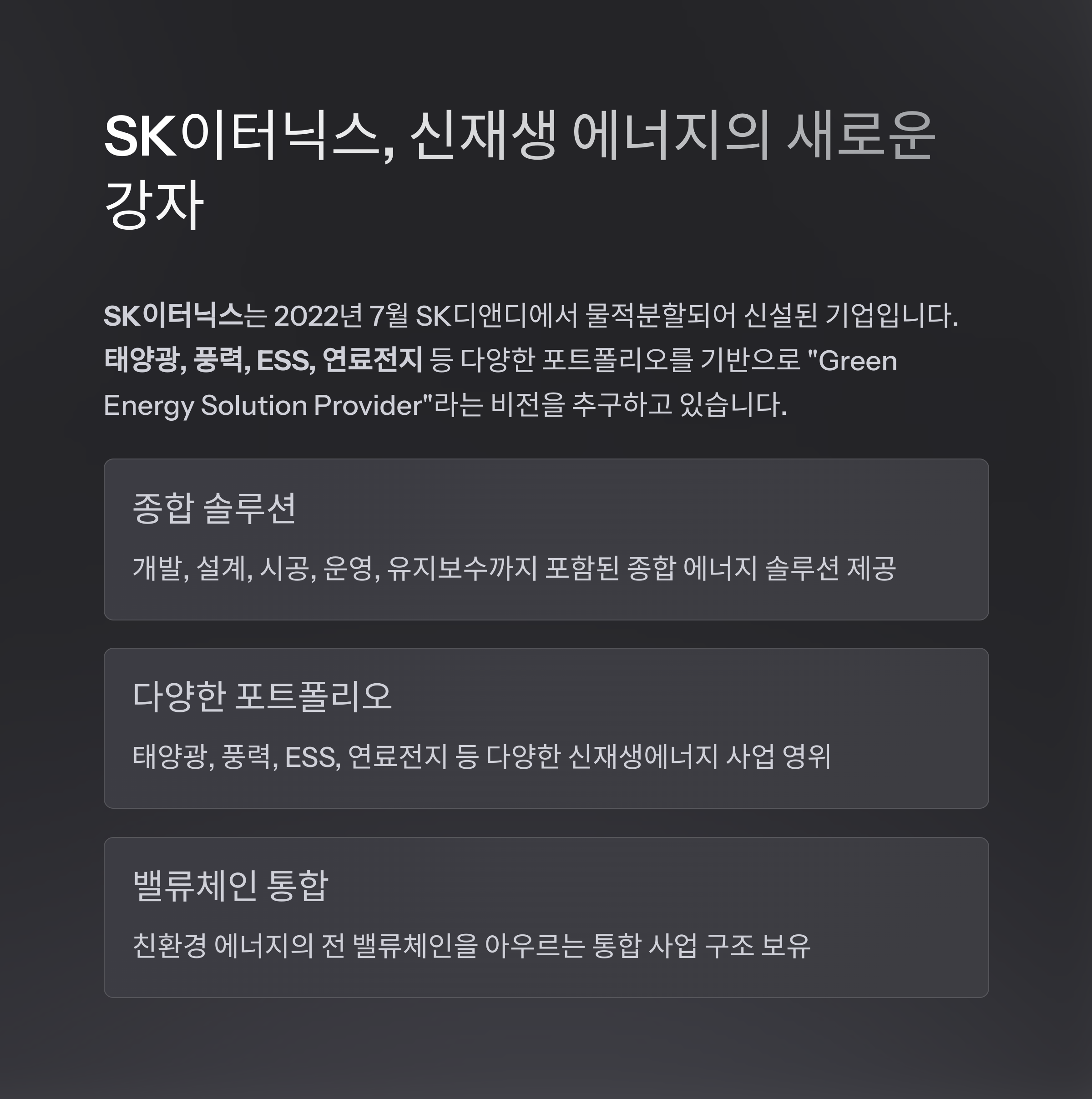SK이터닉스는 SK디앤디에서 물적분할되어 2022년 7월 신설된 기업입니다. 신재생에너지 사업에 특화된 이 회사는 태양광, 풍력, ESS, 연료전지 등 다양한 포트폴리오를 기반으로 “Green Energy Solution Provider”라는 비전을 추구하고 있습니다.