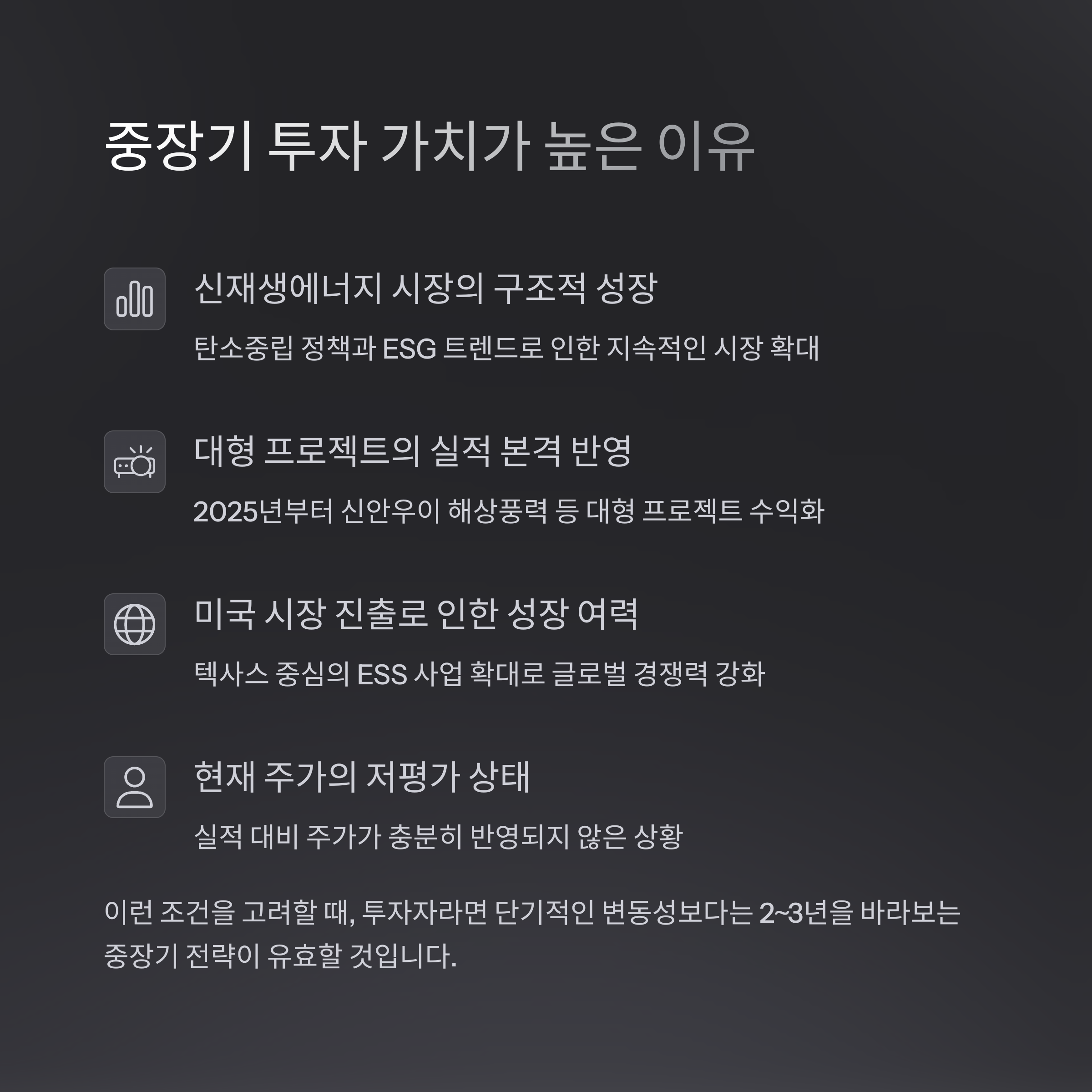 신재생에너지 투자는 이제 전 세계적인 추세입니다. 정부의 탄소중립 정책, ESG 경영 강화 흐름, 글로벌 에너지 수요 증가 등이 맞물리면서 태양광과 풍력, ESS, 연료전지 등 다양한 분야에서의 성장이 기대되고 있습니다.