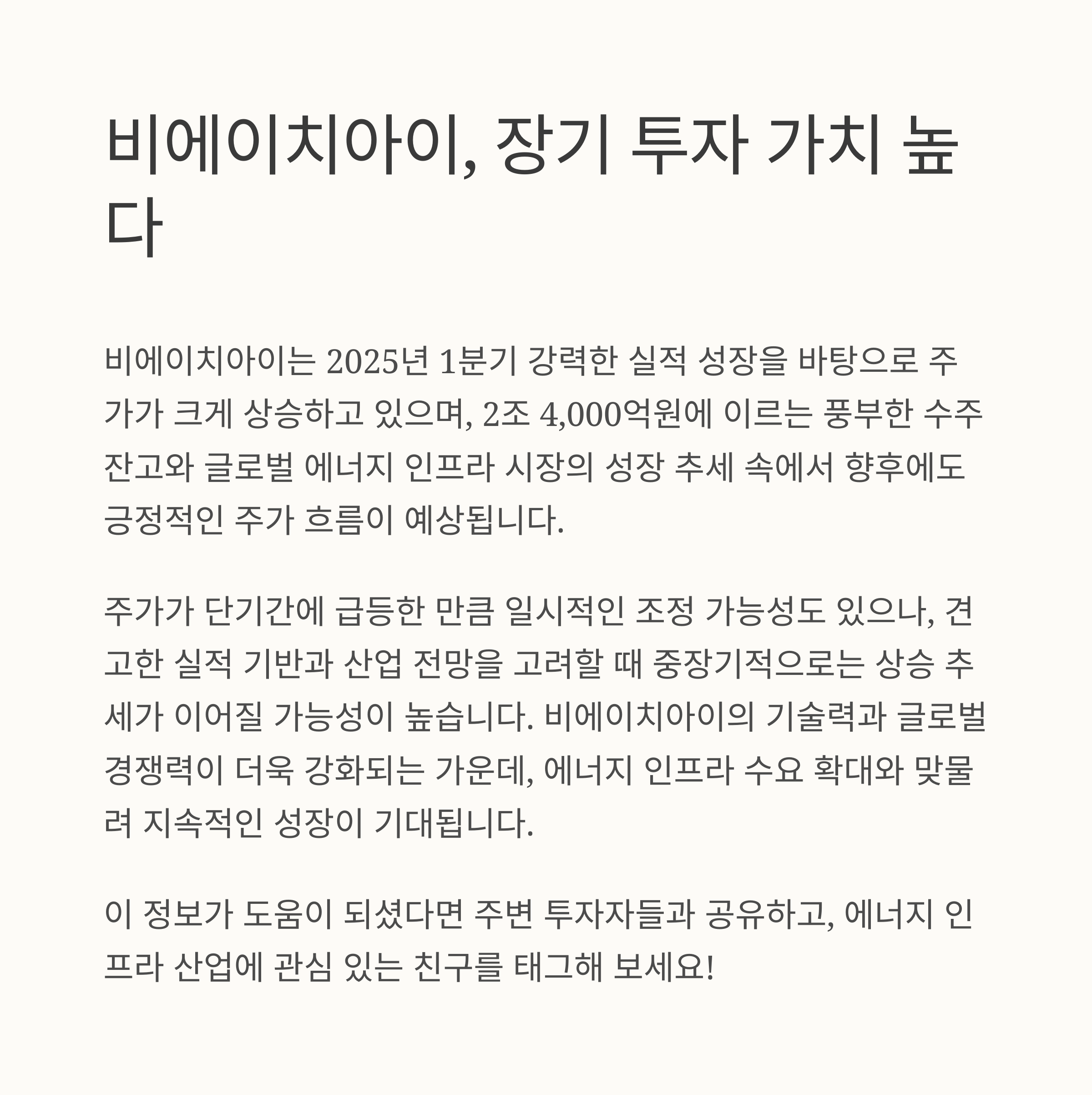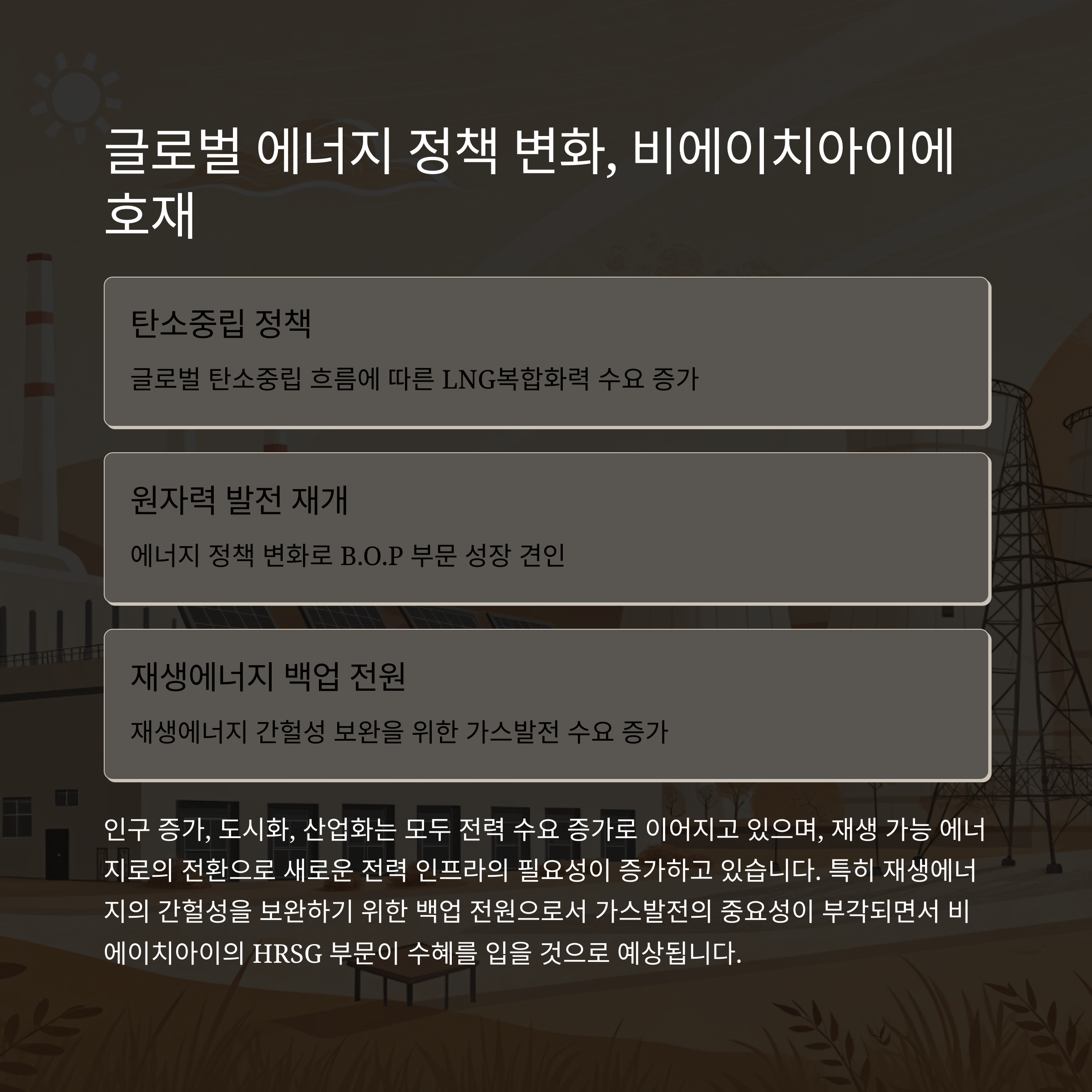 2025년 이후 글로벌 에너지 정책 변화와 재생에너지 보완 수요 확대는 비에이치아이에게 또 한 번의 기회를 제공할 것입니다.