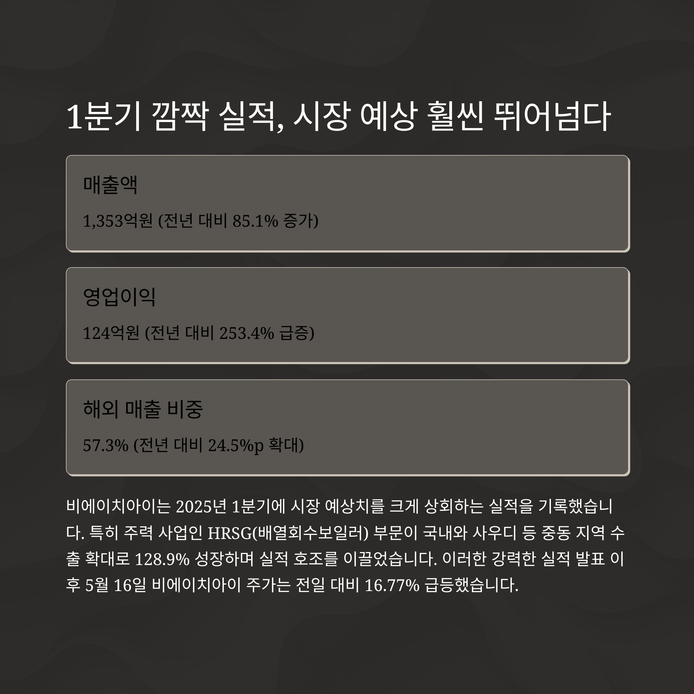 2025년 1분기, 비에이치아이는 전년 동기 대비 85.1% 증가한 매출 1,353억원과