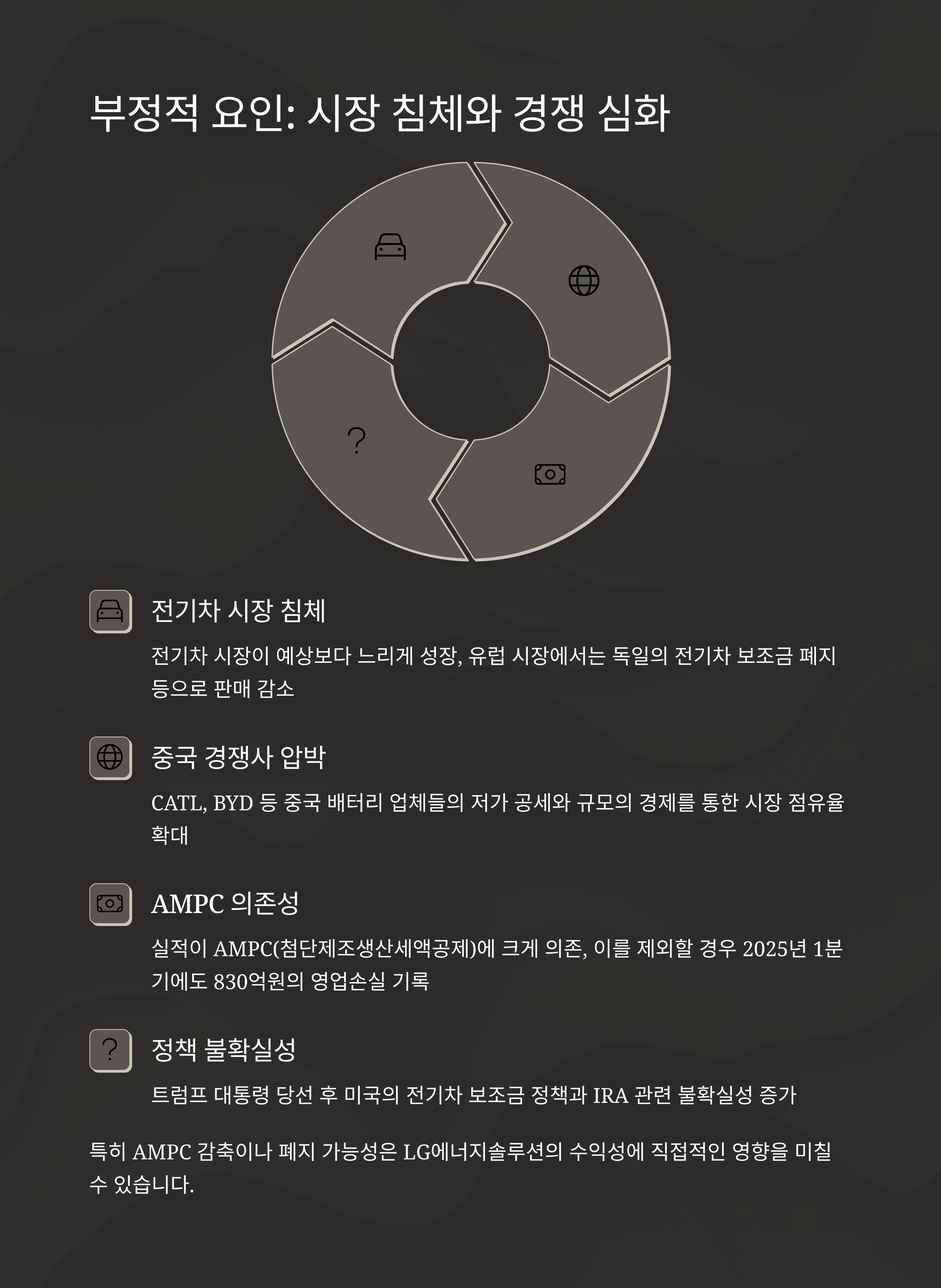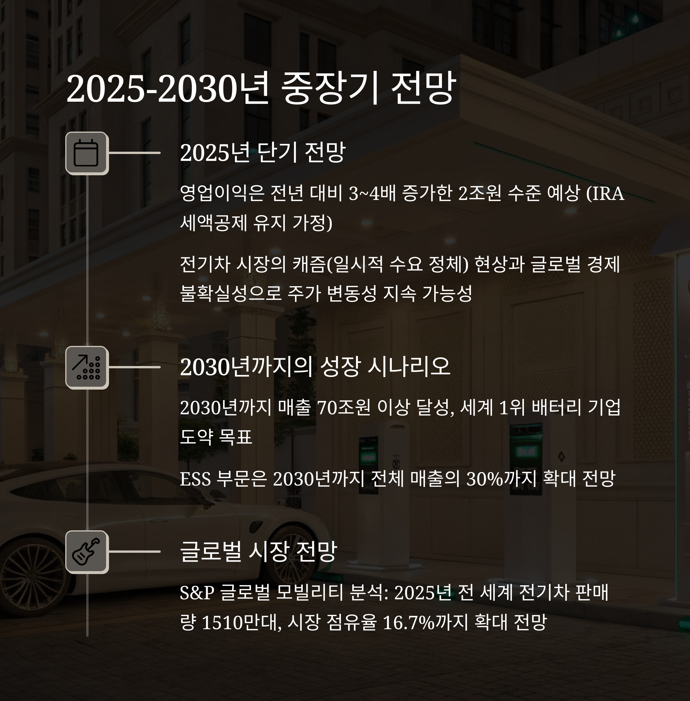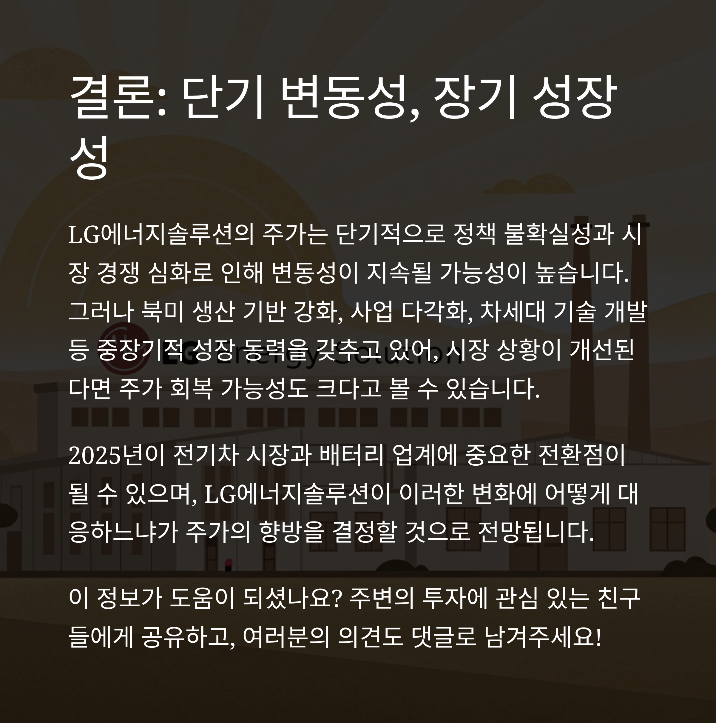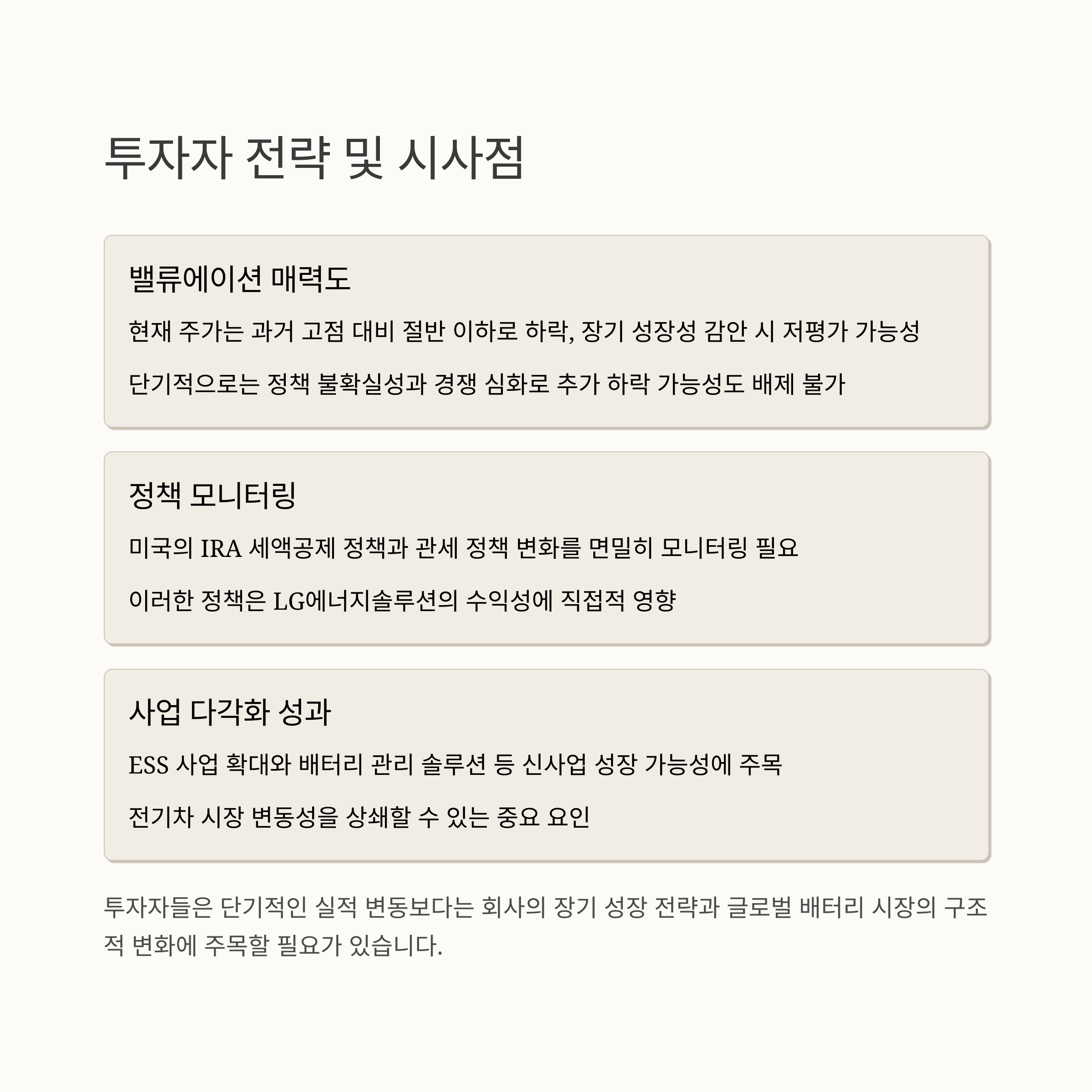 최근 주가 하락의 주요 원인은 전기차 시장의 침체와 중국 배터리 업체의 부상, 미국의 정책 불확실성입니다. 그러나 실적 반등과 북미 생산 확대, 신사업 추진 등의 요소는 긍정적 반전 가능성을 내포하고 있습니다.