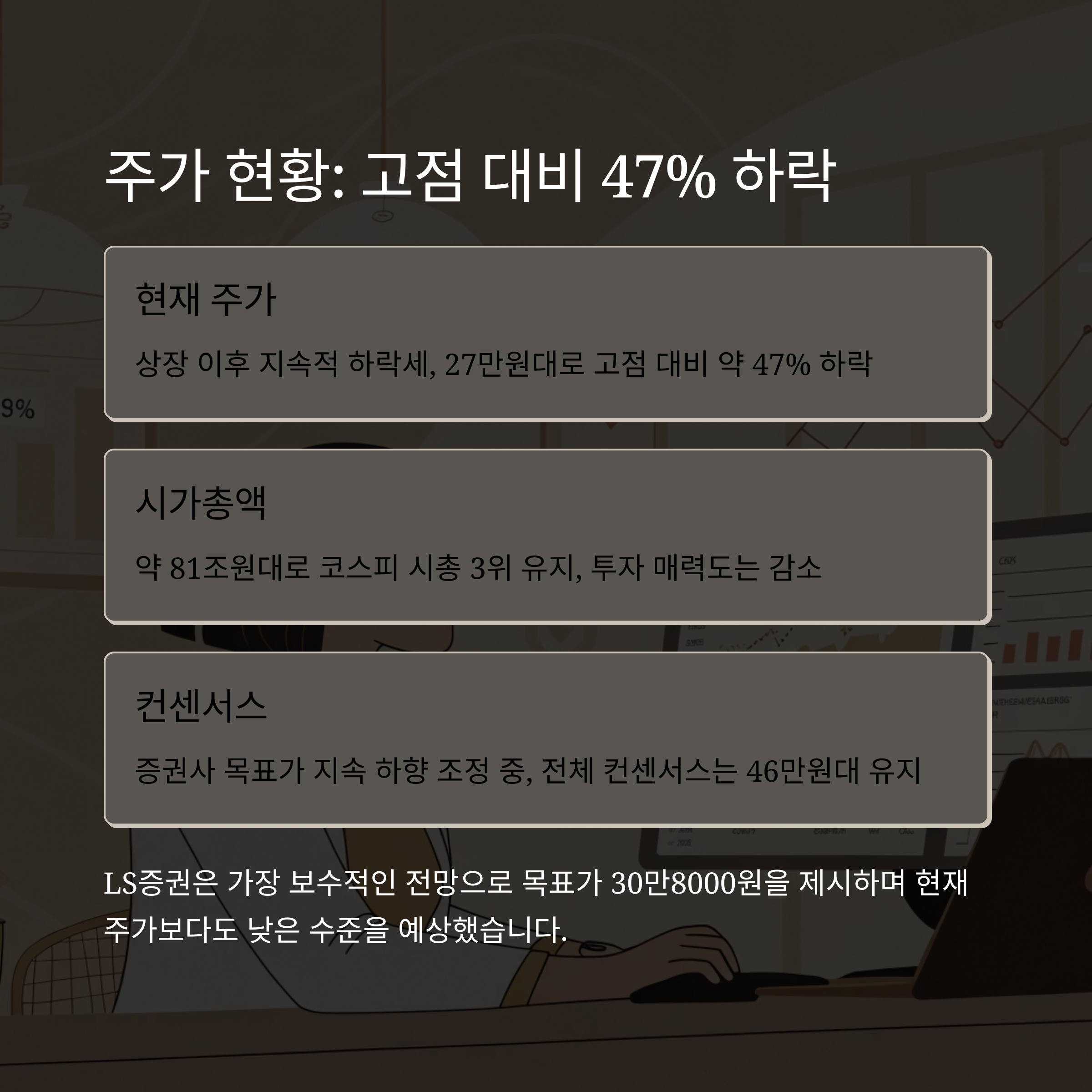 LG에너지솔루션의 주가는 2025년 5월 기준 27만원대로, 한때 고점인 62만원 대비 절반 이상 하락했습니다. 주요 증권사들은 목표가를 하향 조정하고 있지만, 일부는 여전히 40만원대 중반의 목표가를 유지하며 상승 여력을 언급하고 있습니다. 이 글에서는 주가에 영향을 미치는 주요 요소들을 정리하고, 단기·중장기 전망을 제시합니다.