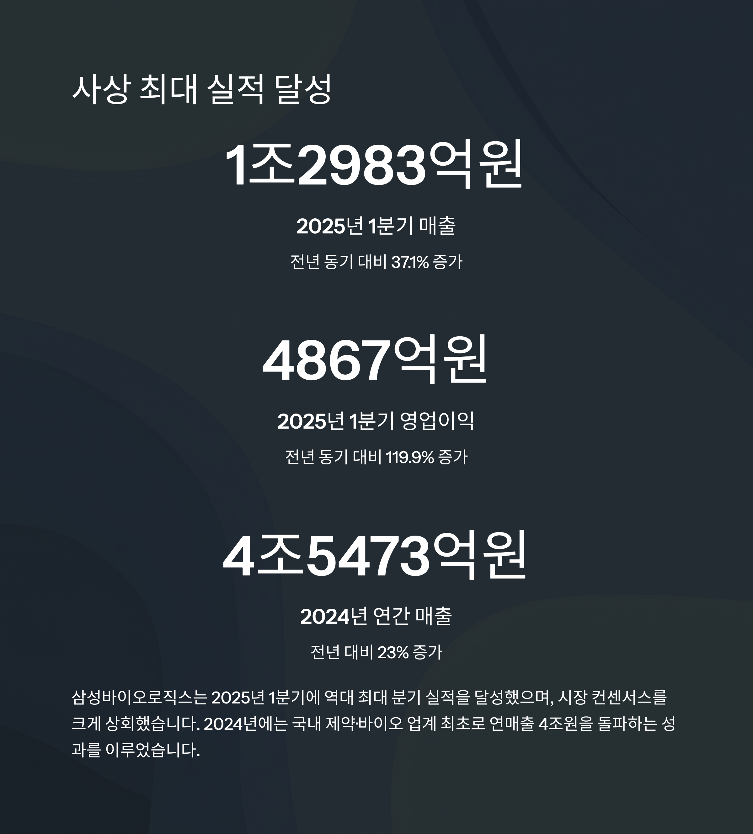 삼성바이오로직스는 2025년 1분기 실적이 역대 최고치를 기록하며 국내 제약·바이오 업계의 선두주자로 자리잡았습니다.
