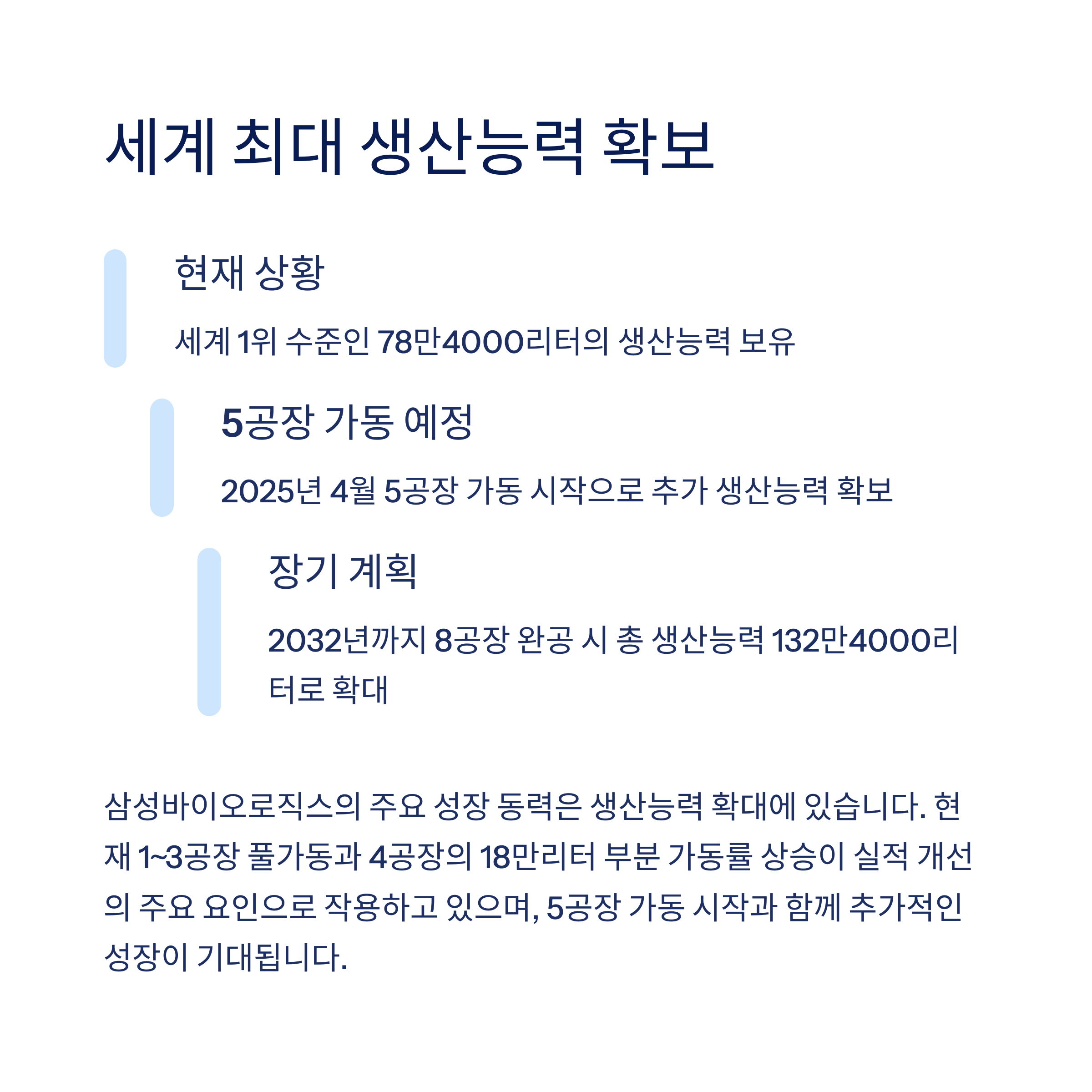 삼성바이오로직스는 현재 78만4000리터의 생산능력을 확보하고 있으며, 2025년 5공장 가동과 2032년까지 8공장 완공을 계획하고 있습니다.
