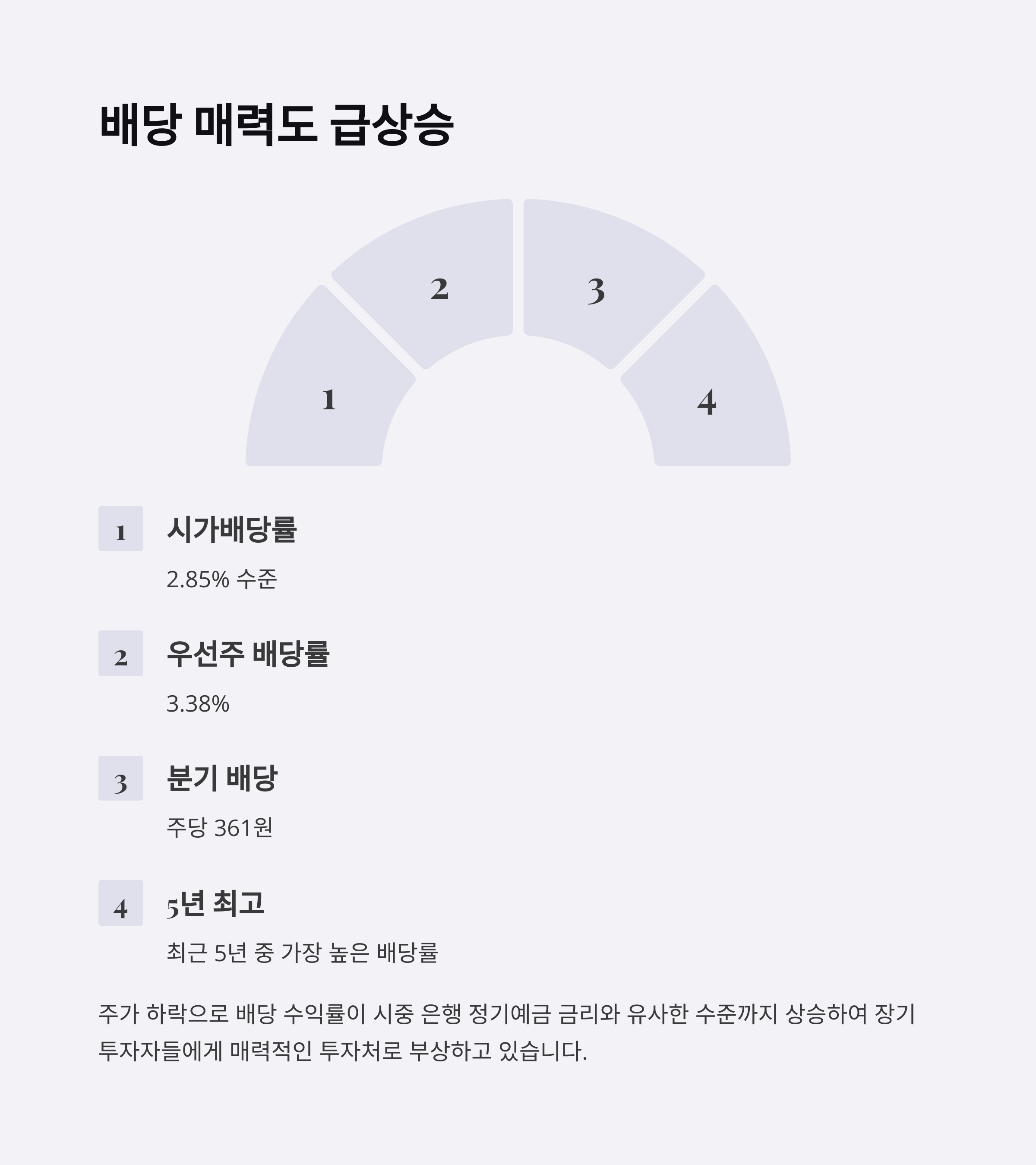 최근 1~3분기 모두 주당 361원의 분기 배당이 진행됐고, 4분기에도 동일 배당이 예상되며 주주환원정책은 견조하게 유지되고 있습니다.