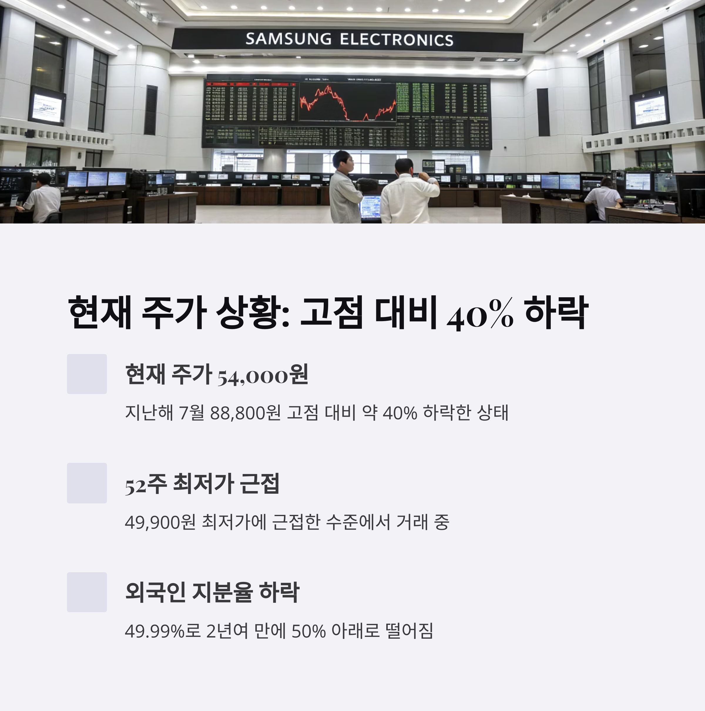 2025년 5월 기준 삼성전자 주가는 54,000원대에서 거래되며, 작년 고점 대비 약 40% 하락한 상태입니다.