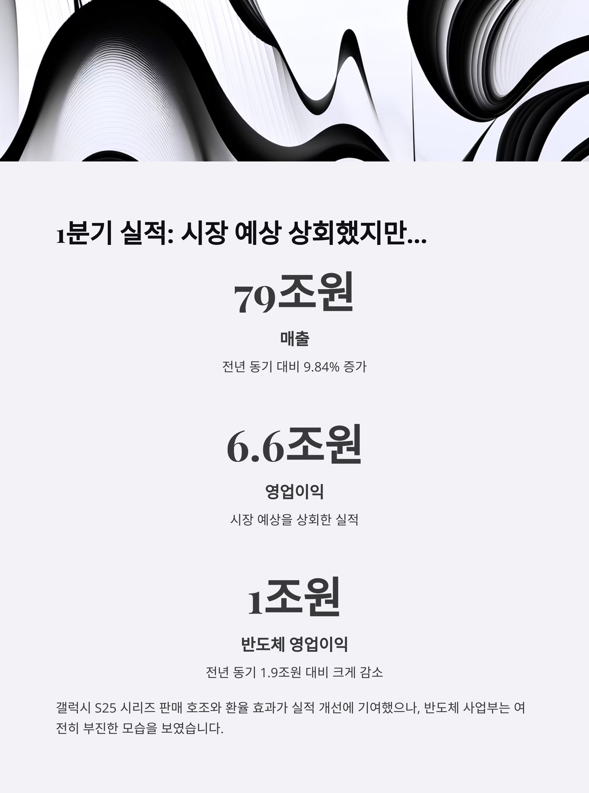 삼성전자의 2025년 1분기 잠정실적은 매출 79조 원, 영업이익 6.6조 원으로 시장 기대를 상회했습니다.