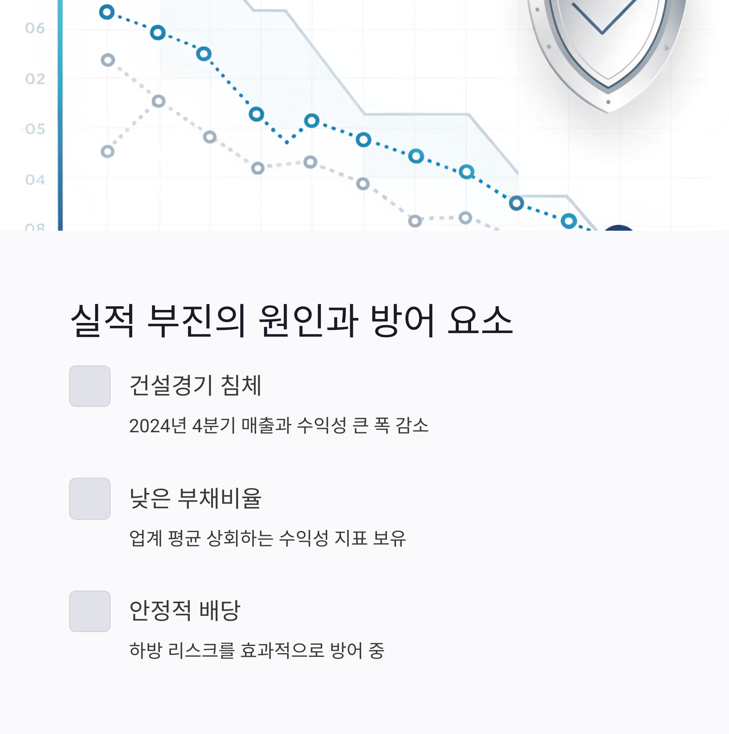그럼에도 불구하고 회사는 낮은 부채비율과 업계 평균을 상회하는 수익성 지표, 그리고 안정적인 배당 정책을 바탕으로 하방 리스크를 효과적으로 방어하고 있습니다.