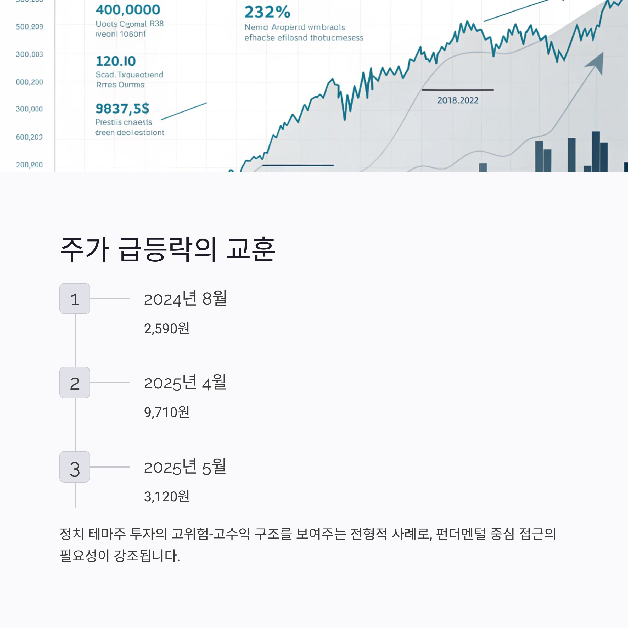 이는 "정치 테마주 투자에 따른 고위험-고수익 구조의 전형적 사례"로, 기술적 분석(볼린저밴드 기준 과매수 진입)에 따른 차익 실현 매물도 주가 하락의 원인으로 지목됩니다.