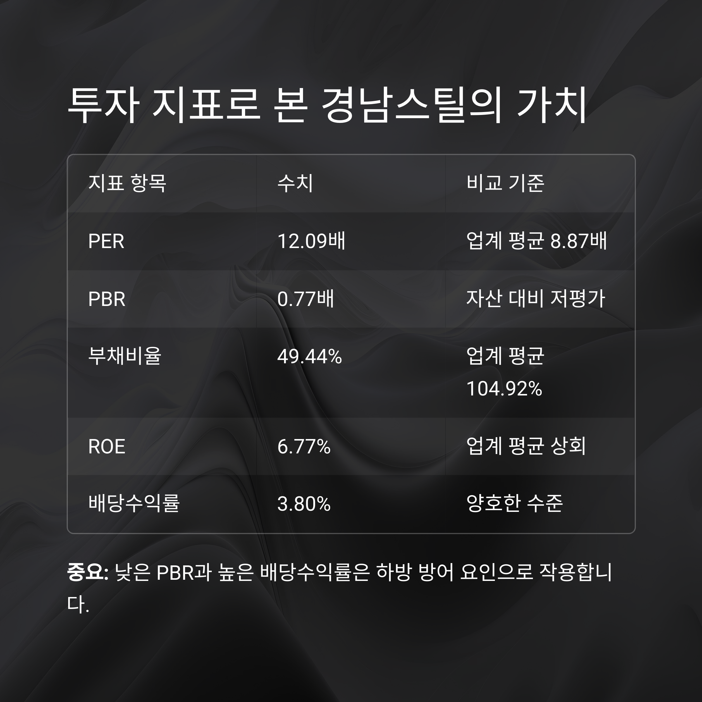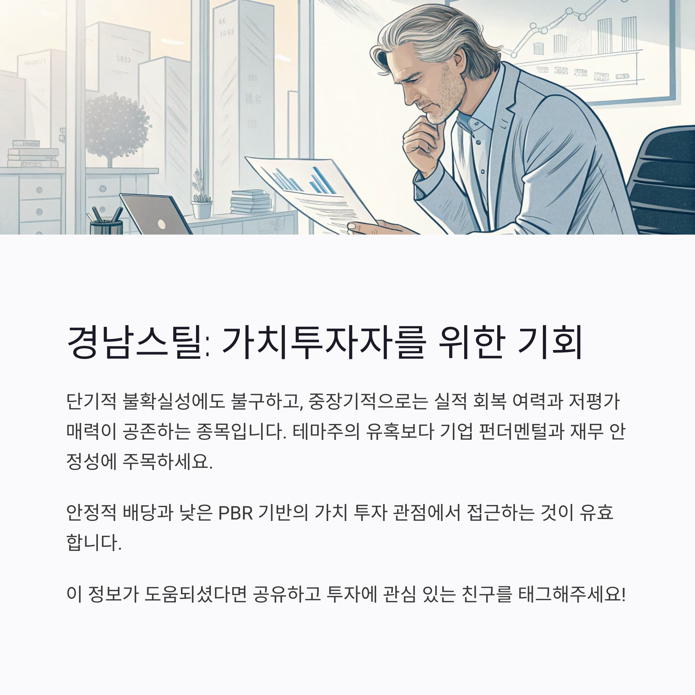 "경남스틸은 단기적으로는 불확실성이 높지만, 중장기적으론 실적 회복 여력과 저평가 매력이 공존하는 종목입니다."