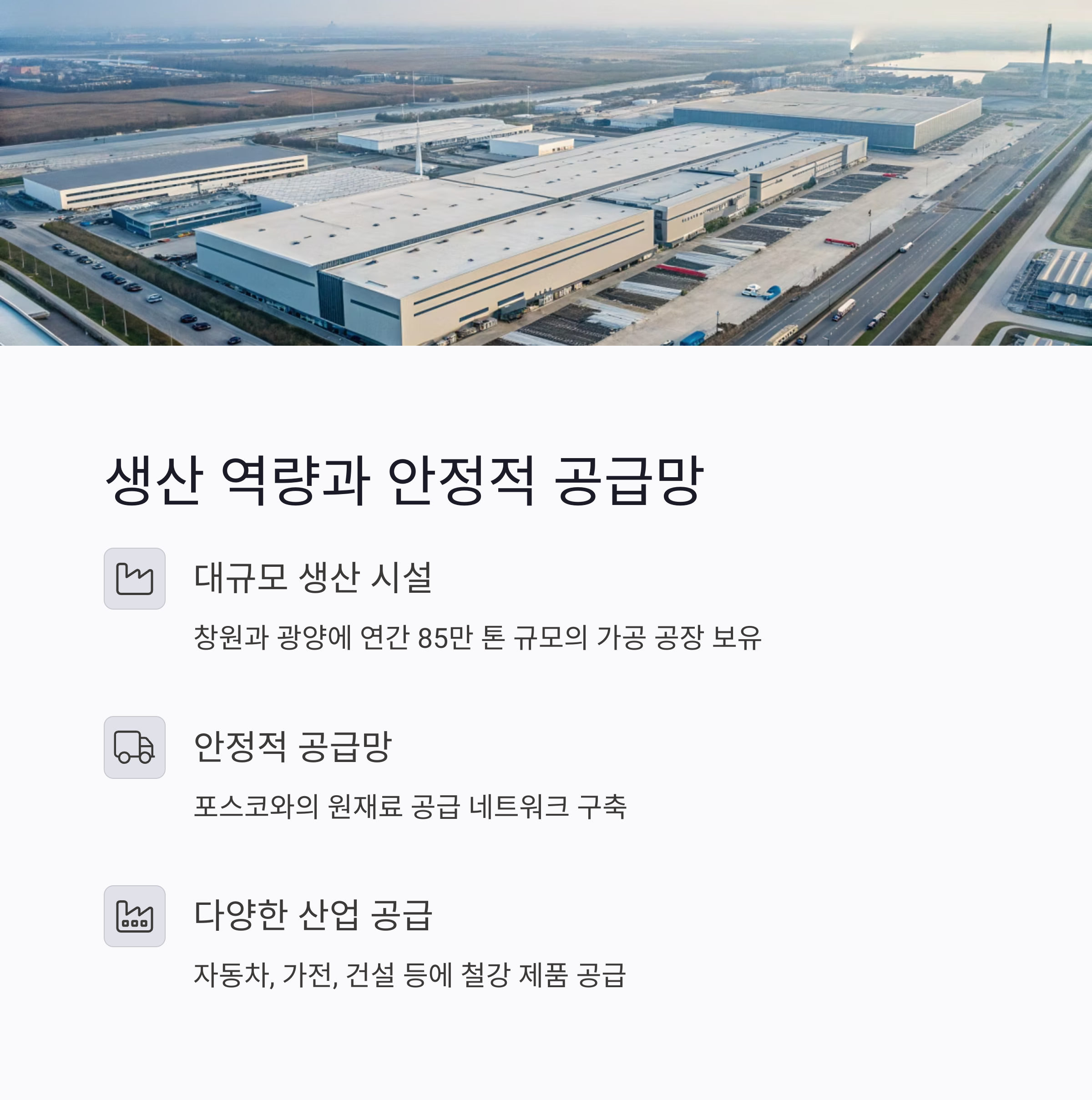 포스코와의 안정적인 원재료 공급망을 기반으로 자동차, 가전, 건설 등 다양한 산업에 철강 제품을 공급하고 있습니다.