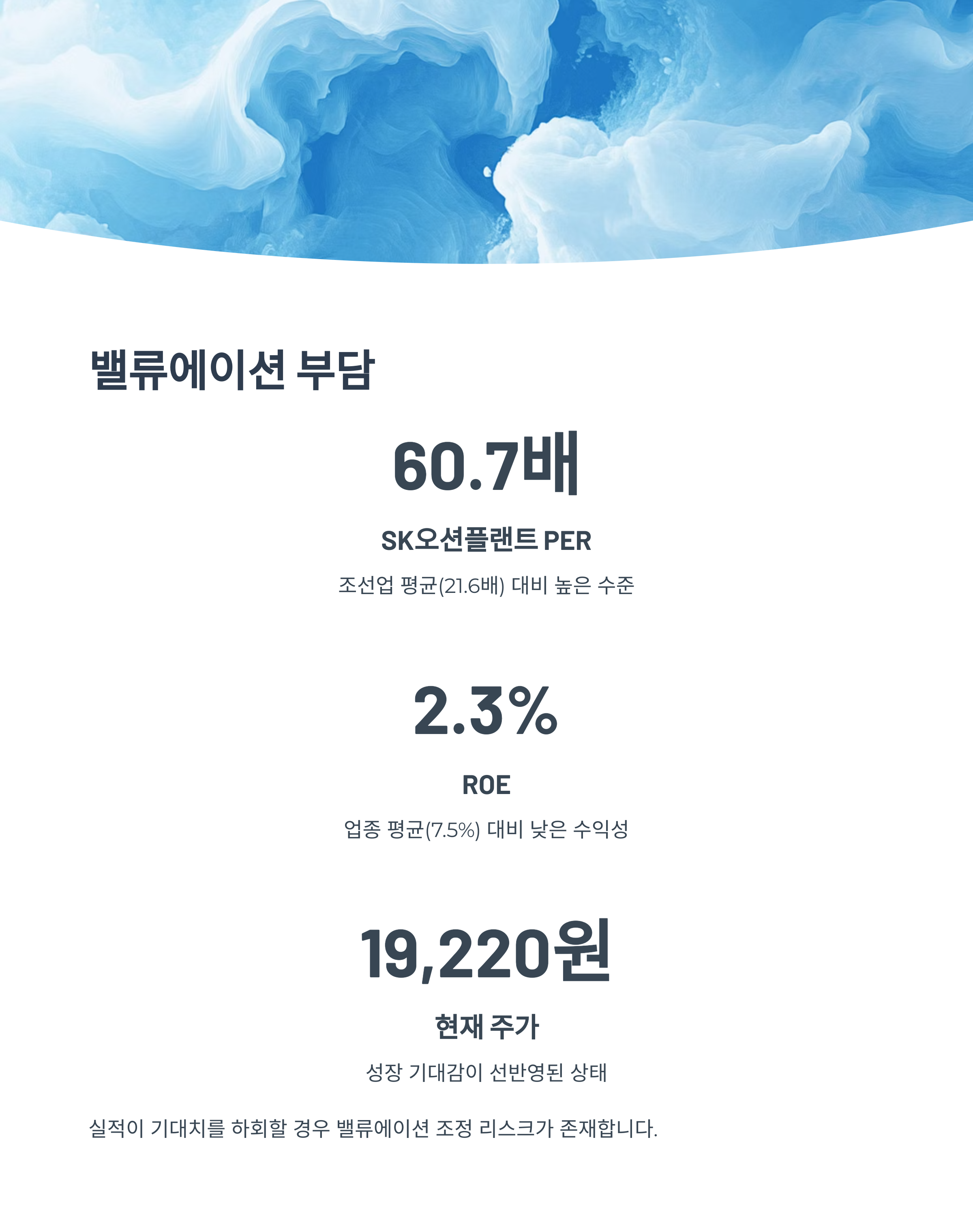 ROE 역시 2.3%로 업종 평균(7.5%) 대비 낮은 수준이며, 이는 성장 기대감이 선반영된 결과로 해석됩니다.