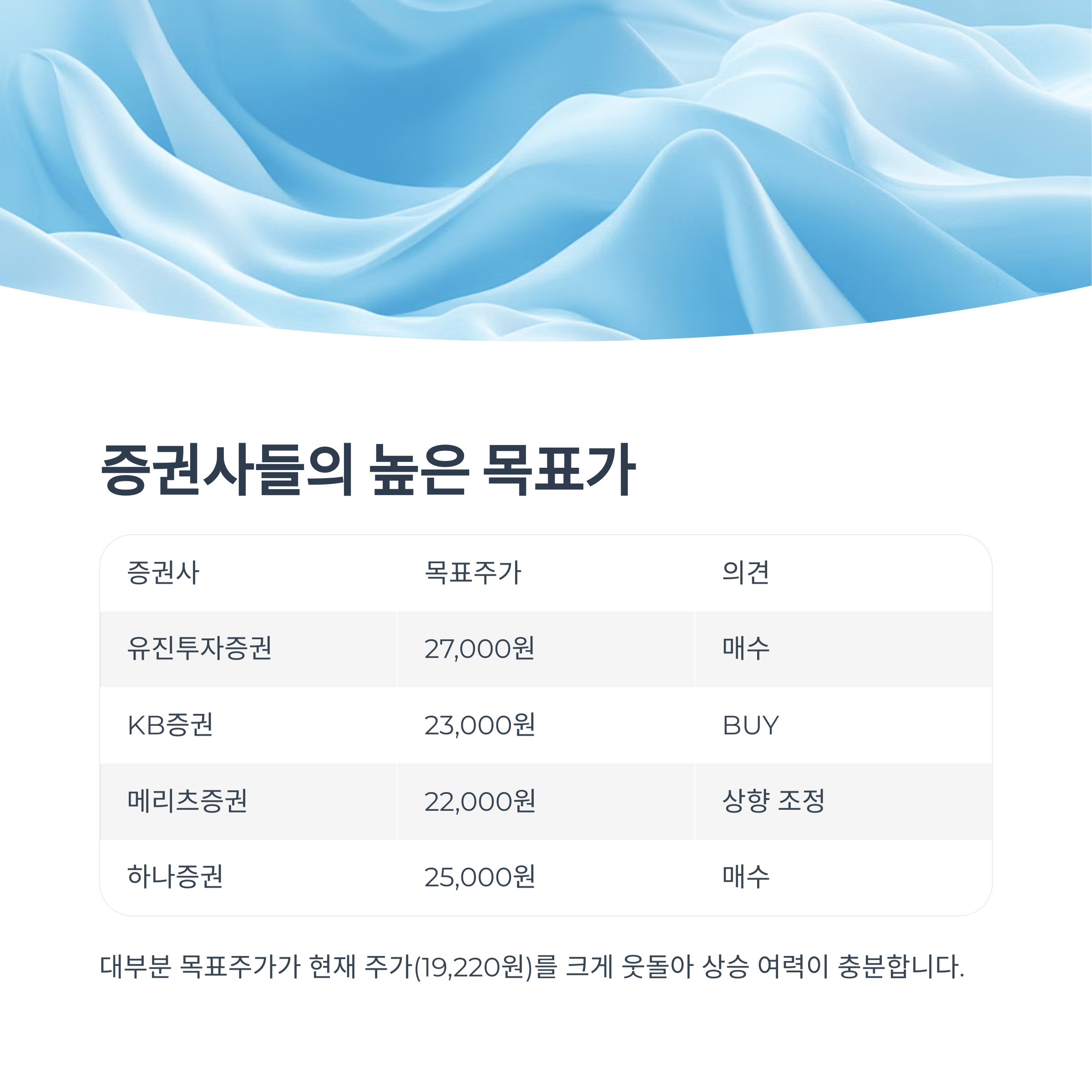 대부분 목표주가가 현재 주가(19,220원)를 크게 웃돌고 있어 상승 여력 충분하다는 평가입니다.