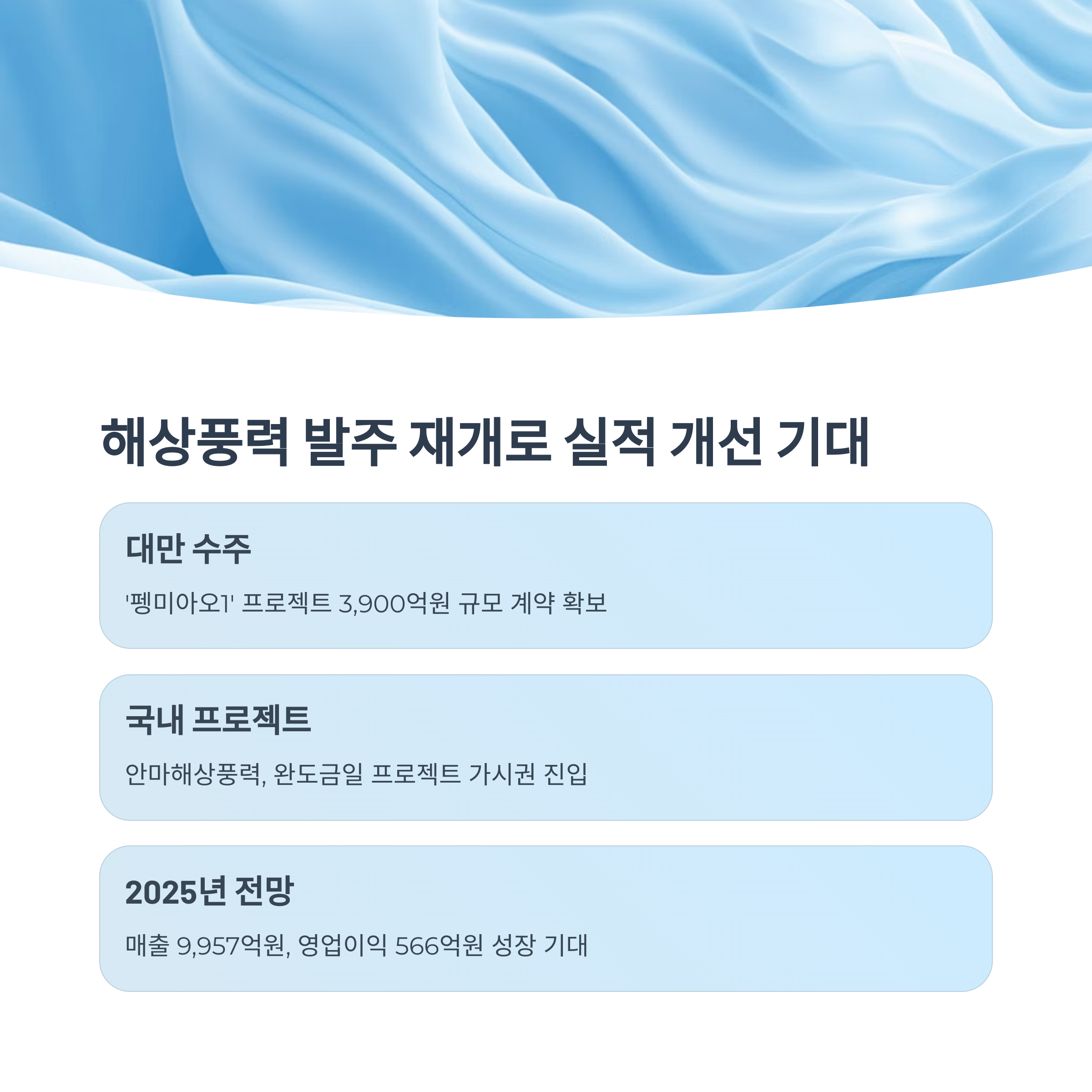 이는 해상풍력 발주 시장의 회복 흐름을 보여주는 사례로, 대만뿐 아니라 국내에서도 안마해상풍력과 완도금일 프로젝트가 가시권에 들어와 있습니다.