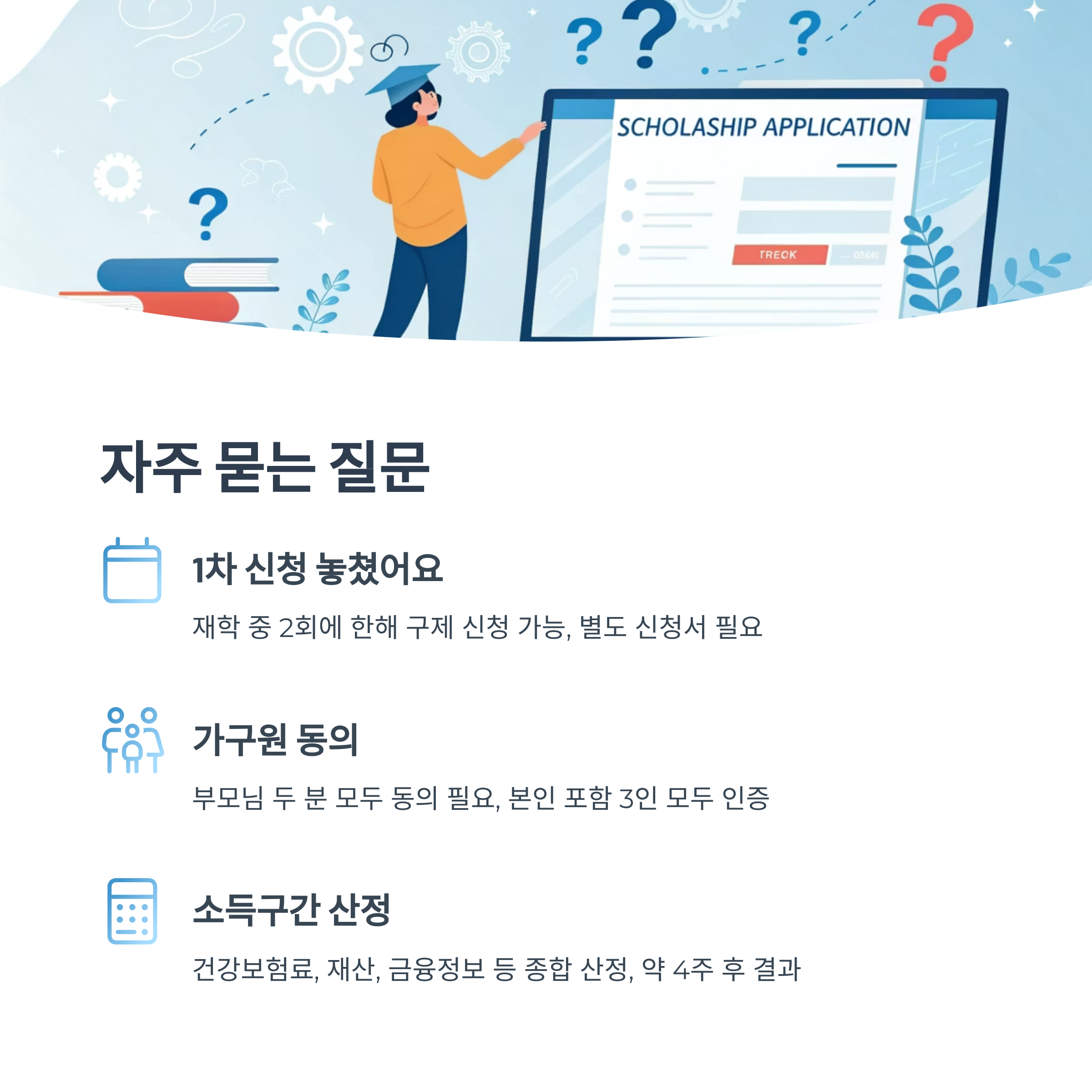 A3. 소득구간은 신청자의 가구원 소득·재산·부채 등을 종합하여 건강보험료, 금융정보 등을 바탕으로 산정됩니다. 제출한 서류와 동의 완료일을 기준으로 약 4주 후 결과가 발표되며, 이후 장학금 지급 여부가 결정됩니다. 소득구간은 장학금뿐만 아니라 대학 내 다양한 복지 혜택의 기준이 되므로 중요합니다.