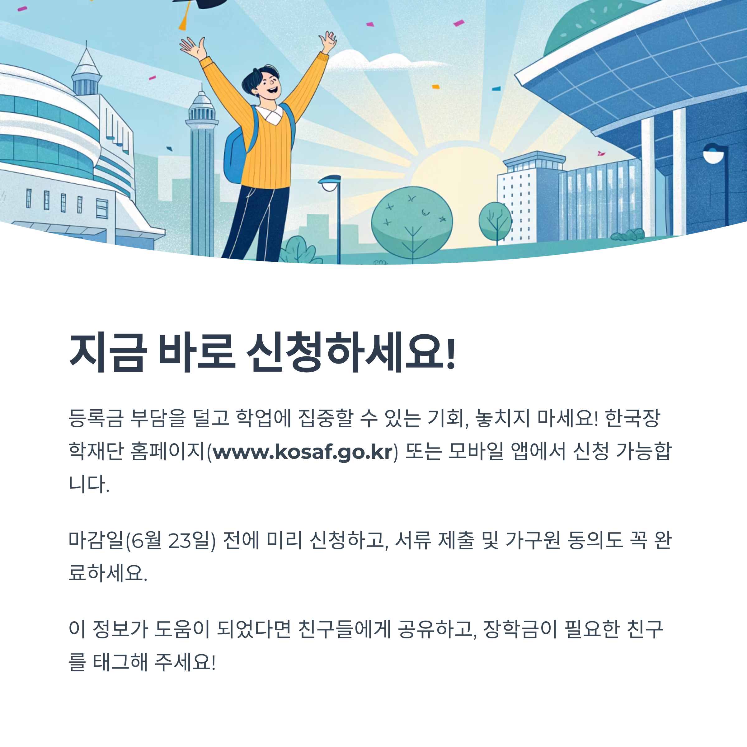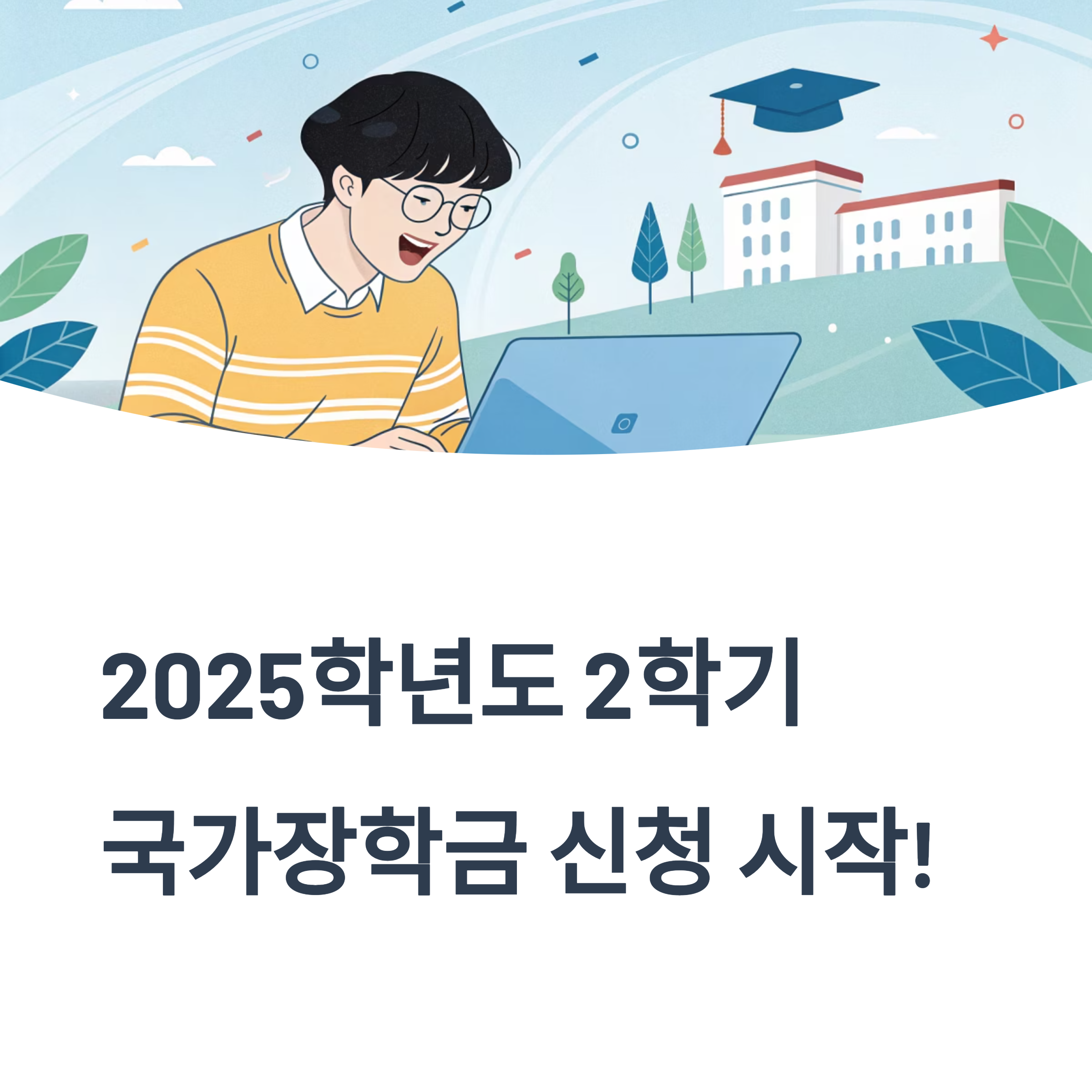 2025학년도 2학기 국가장학금 1차 신청이 시작되었습니다. 등록금 부담을 덜고 다양한 장학 혜택을 받기 위해서는 이번 신청 기간을 절대 놓치지 마세요. 특히 재학생은 1차 신청이 원칙이며, 미신청 시 구제 신청이 제한되므로 주의가 필요합니다. 신청은 2025년 5월 23일(금) 오전 9시부터 6월 23일(월) 오후 6시까지 진행되며, 서류 제출 및 가구원 정보제공 동의는 6월 30일(월) 오후 6시까지 완료해야 합니다.
