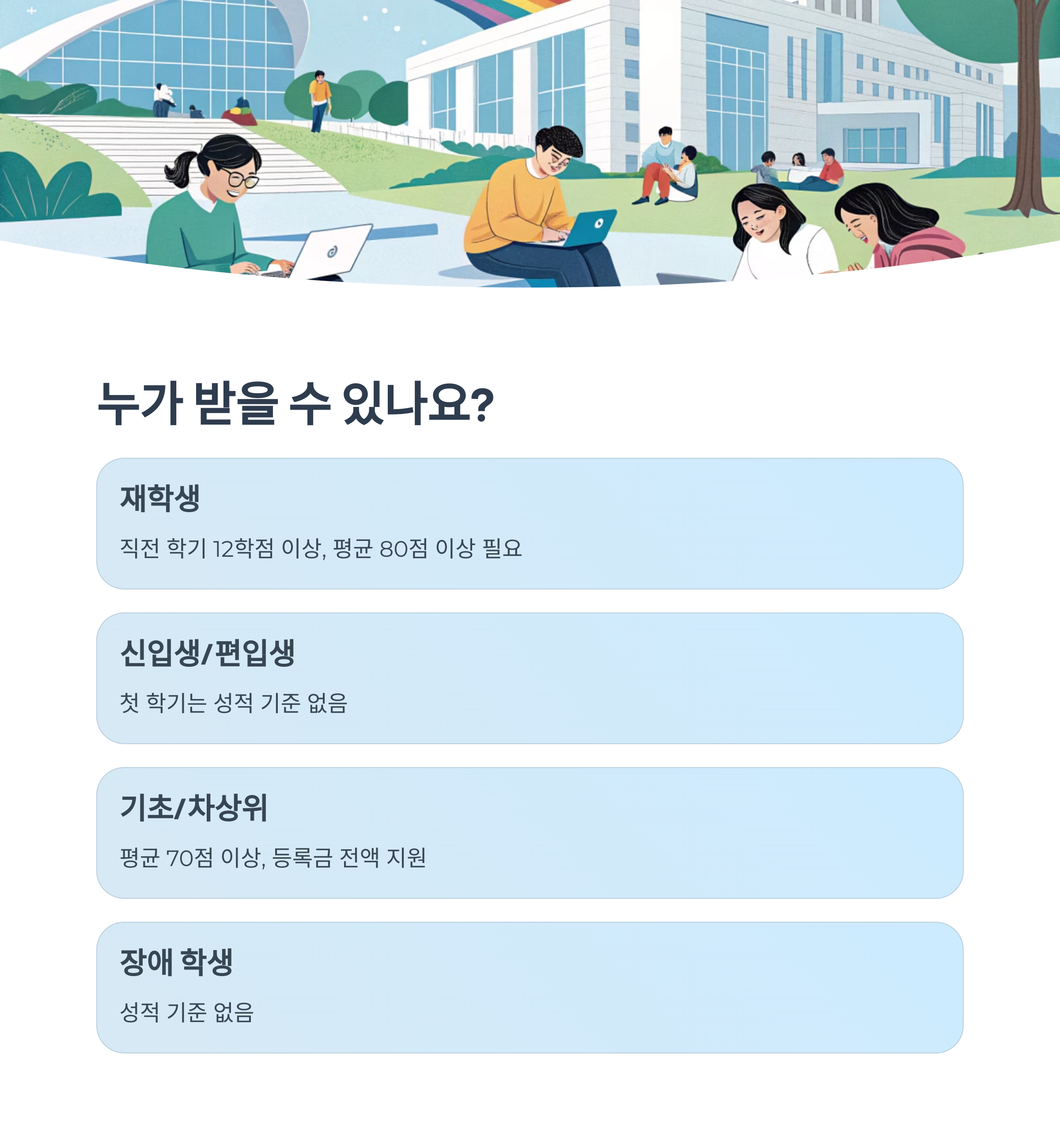 | 재학생 | 1차 신청 필수, 직전 학기 12학점 이상 이수, 평균 80점 이상 | 소득 구간에 따라 등록금 일부 또는 전액 지원 |