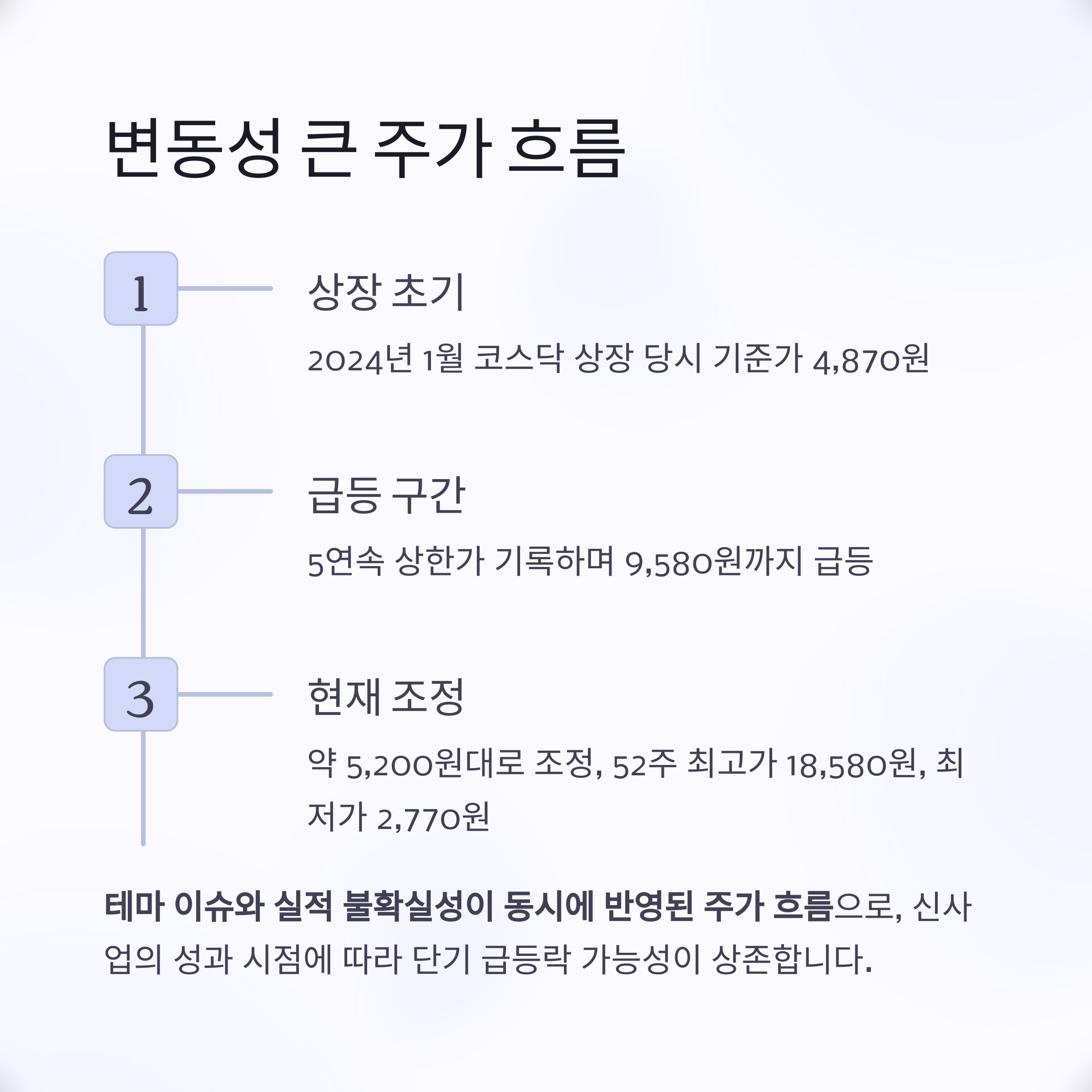2024년 1월 코스닥 상장 당시 기준가 4,870원에서 5연속 상한가를 기록하며 9,580원까지 급등했던 주가는,