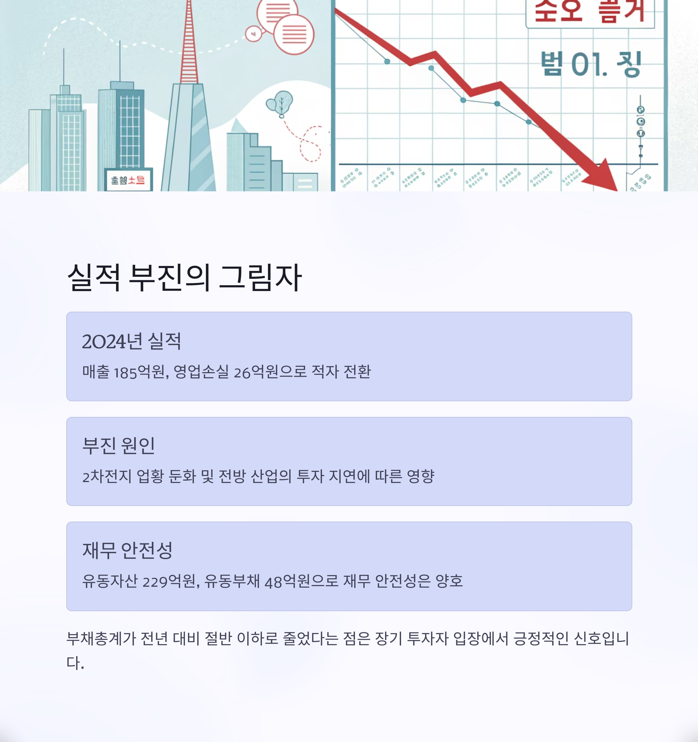 다만 유동자산 229억원, 유동부채 48억원으로 재무 안전성은 양호하며, 부채총계가 전년 대비 절반 이하로 줄었다는 점은 장기 투자자 입장에서 긍정적입니다.