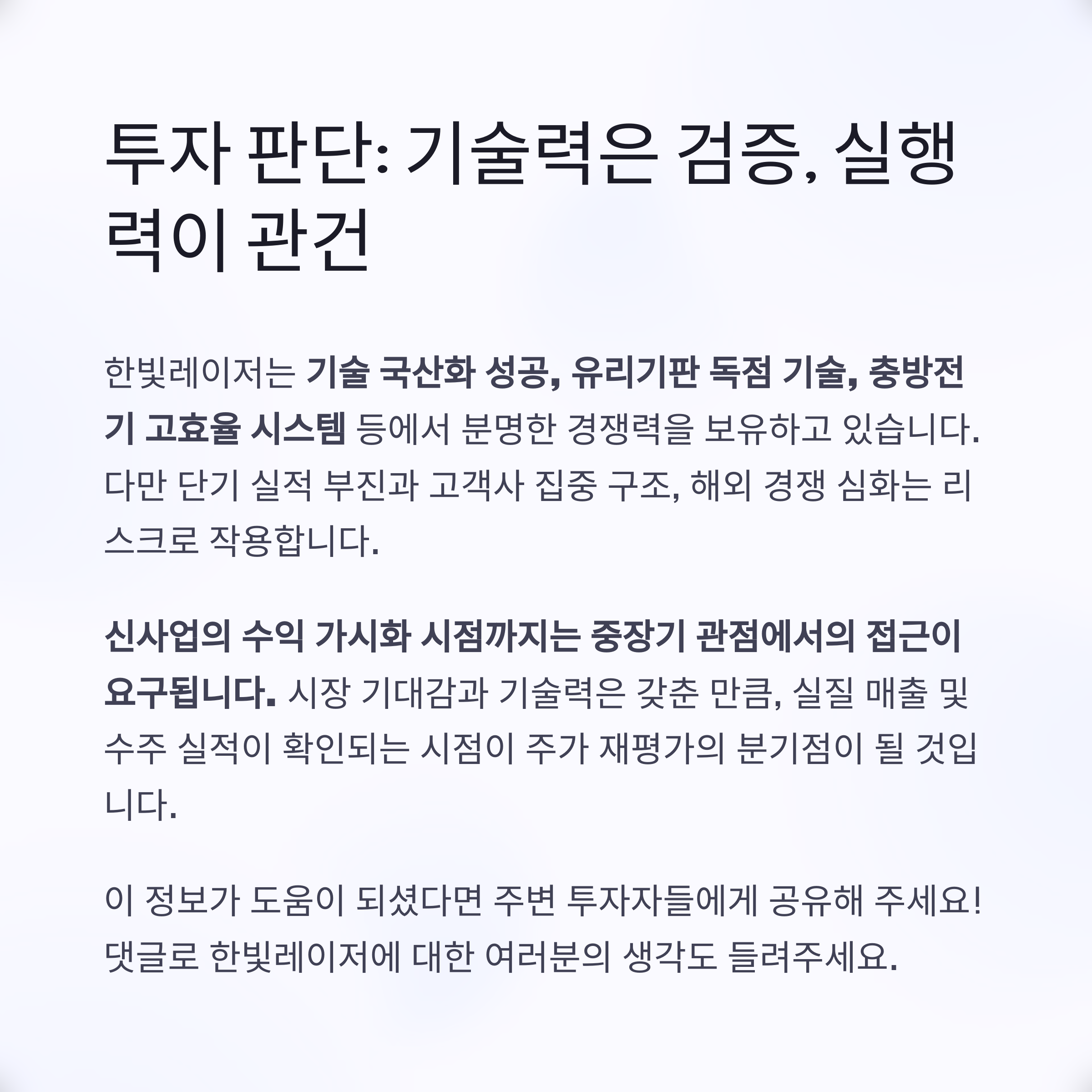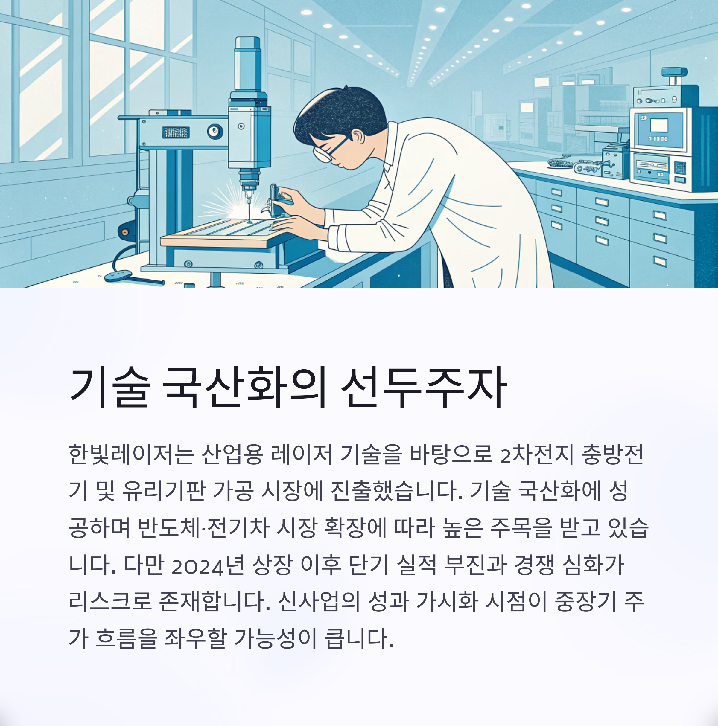한빛레이저는 기술 국산화 성공, 유리기판 독점 기술, 충방전기 고효율 시스템 등에서 분명한 경쟁력을 보유하고 있습니다.