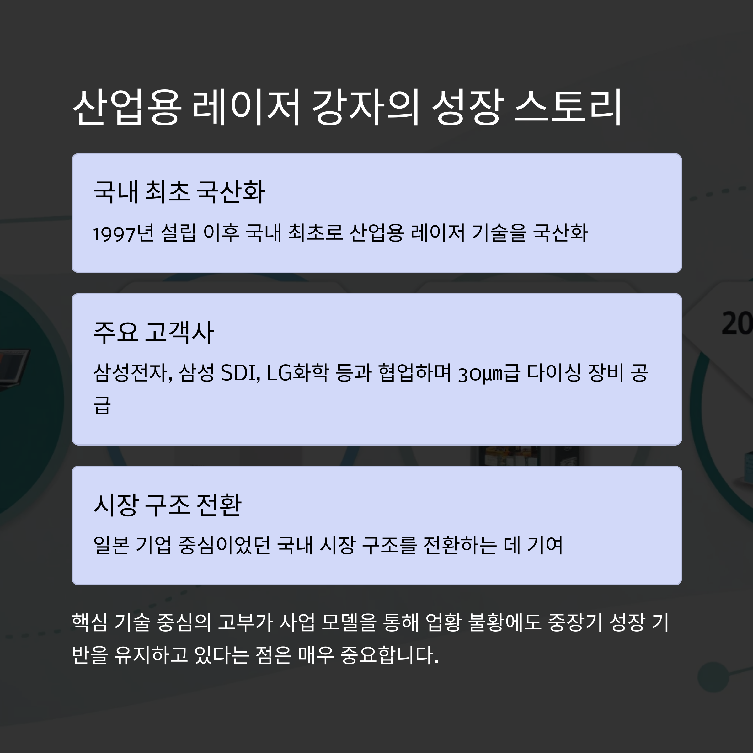 삼성전자, 삼성 SDI, LG화학 등과의 협업을 통해 30㎛급 다이싱 장비를 공급하며 기술력을 입증받았고, 일본 기업 중심이었던 국내 시장 구조를 전환하는 데 기여했습니다.
