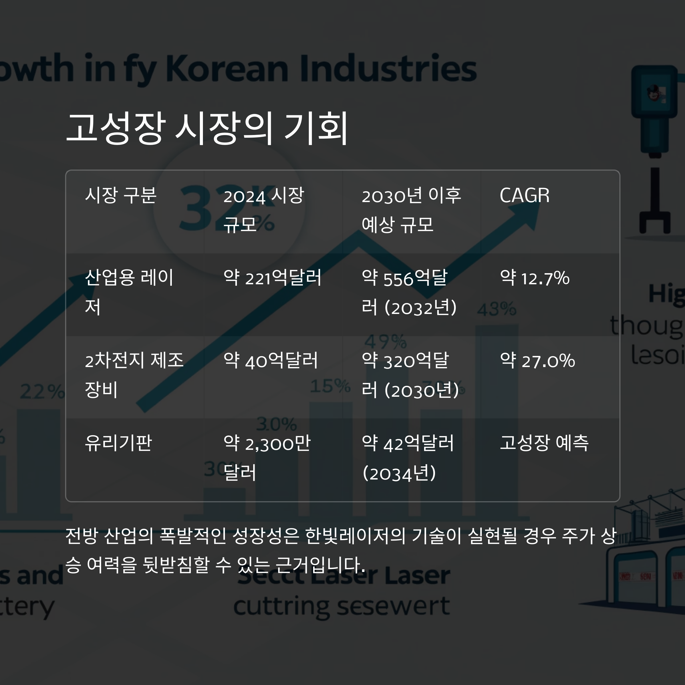 급변하는 산업 환경 속, 레이저 기술 전문기업 한빛레이저가 유리기판과 충방전기 시장에서 어떤 가능성을 보이고 있는지 주가 전망과 함께 분석합니다