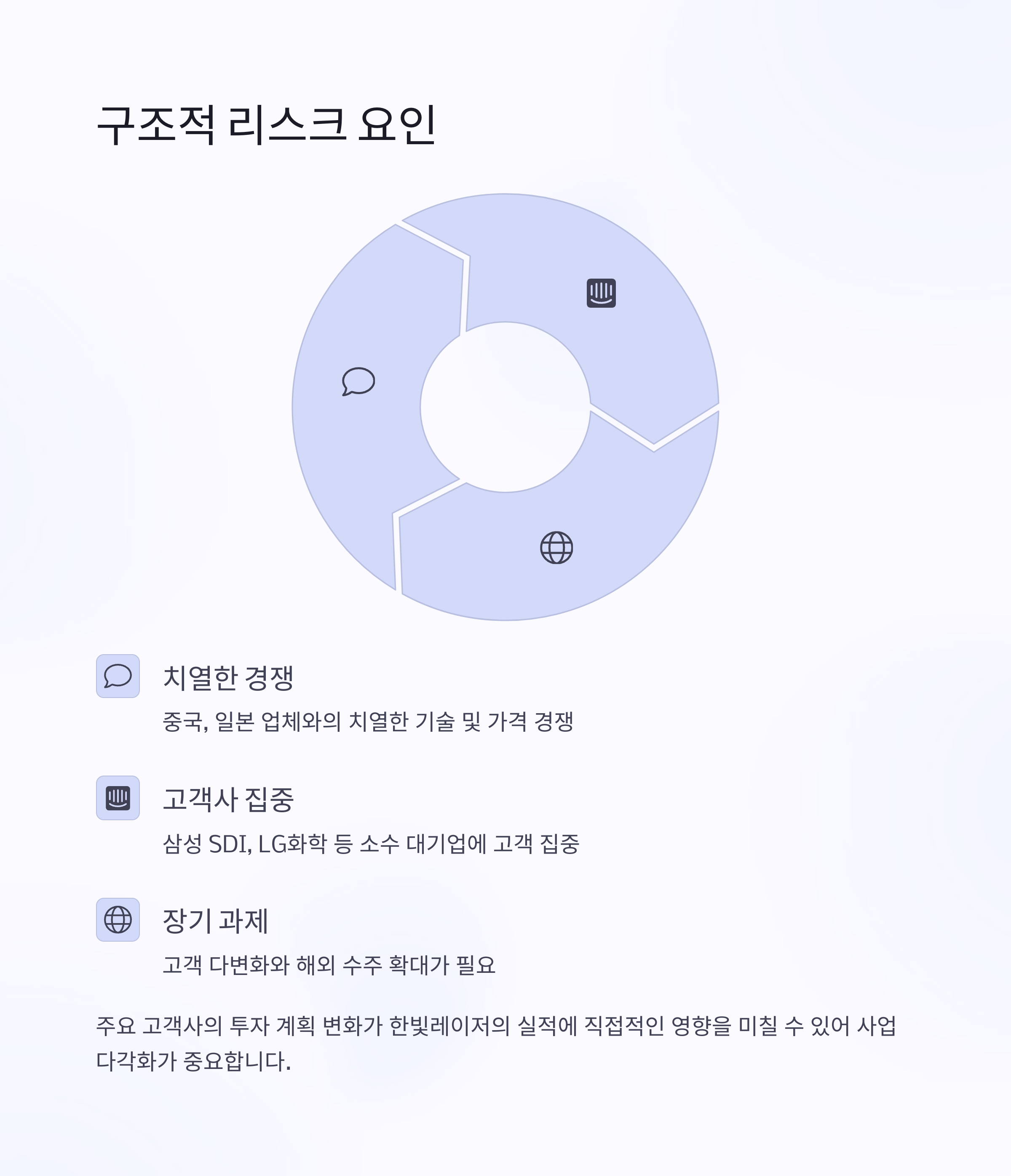 게다가 주요 고객사가 삼성 SDI, LG화학 등 소수 대기업에 집중되어 있어, 이들 기업의 투자 계획 변화가 실적에 직접적인 영향을 미칠 수 있습니다.