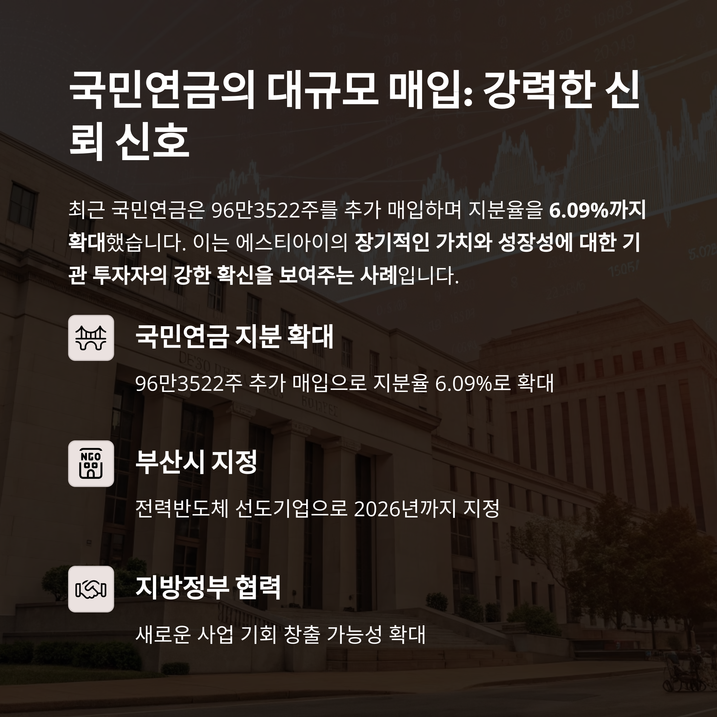 이는 에스티아이의 장기적인 가치와 성장성에 대한 기관 투자자의 강한 확신을 보여주는 사례입니다.