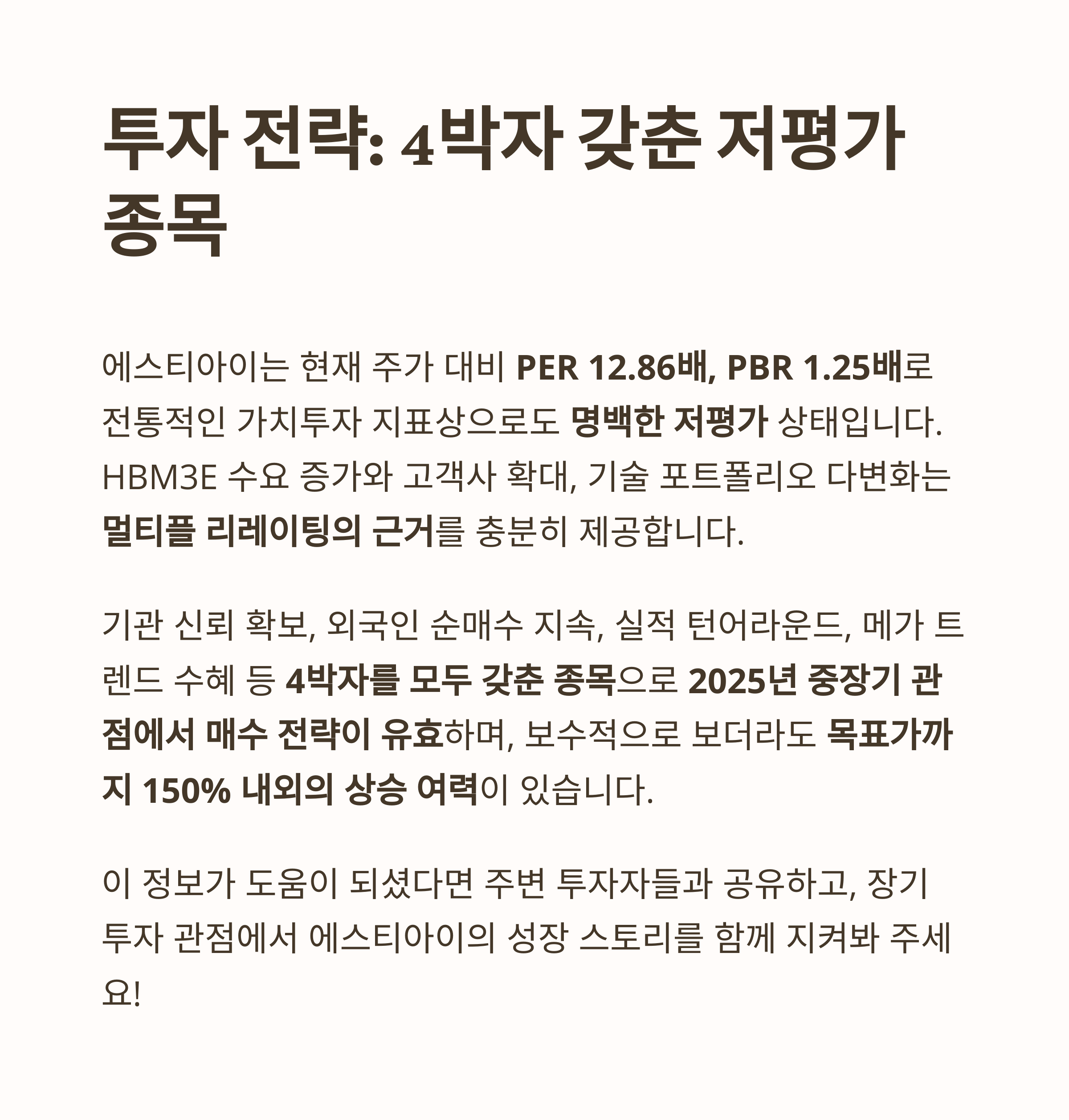 이에 더해, HBM3E 수요 증가와 고객사 확대, 기술 포트폴리오 다변화 등은 멀티플 리레이팅의 근거를 충분히 제공합니다.