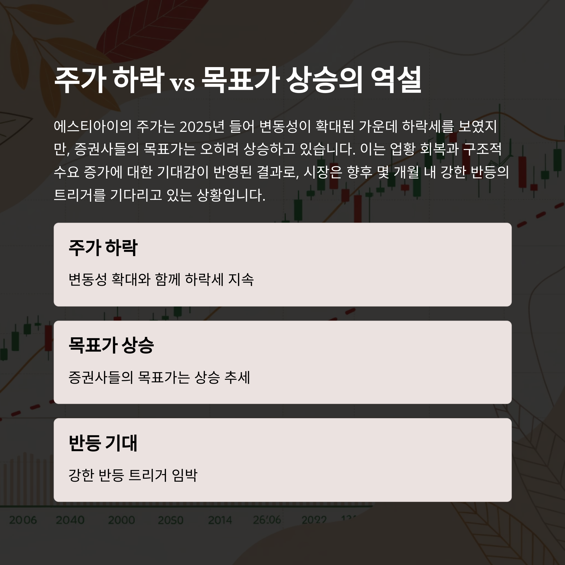 에스티아이의 주가는 2025년 들어 변동성이 확대된 가운데 하락세를 보였지만, 증권사들의 목표가는 오히려 상승하고 있습니다. 이는 업황 회복과 구조적 수요 증가에 대한 기대감이 반영된 결과로, 시장은 향후 몇 개월 내 강한 반등의 트리거를 기다리고 있는 상황입니다.