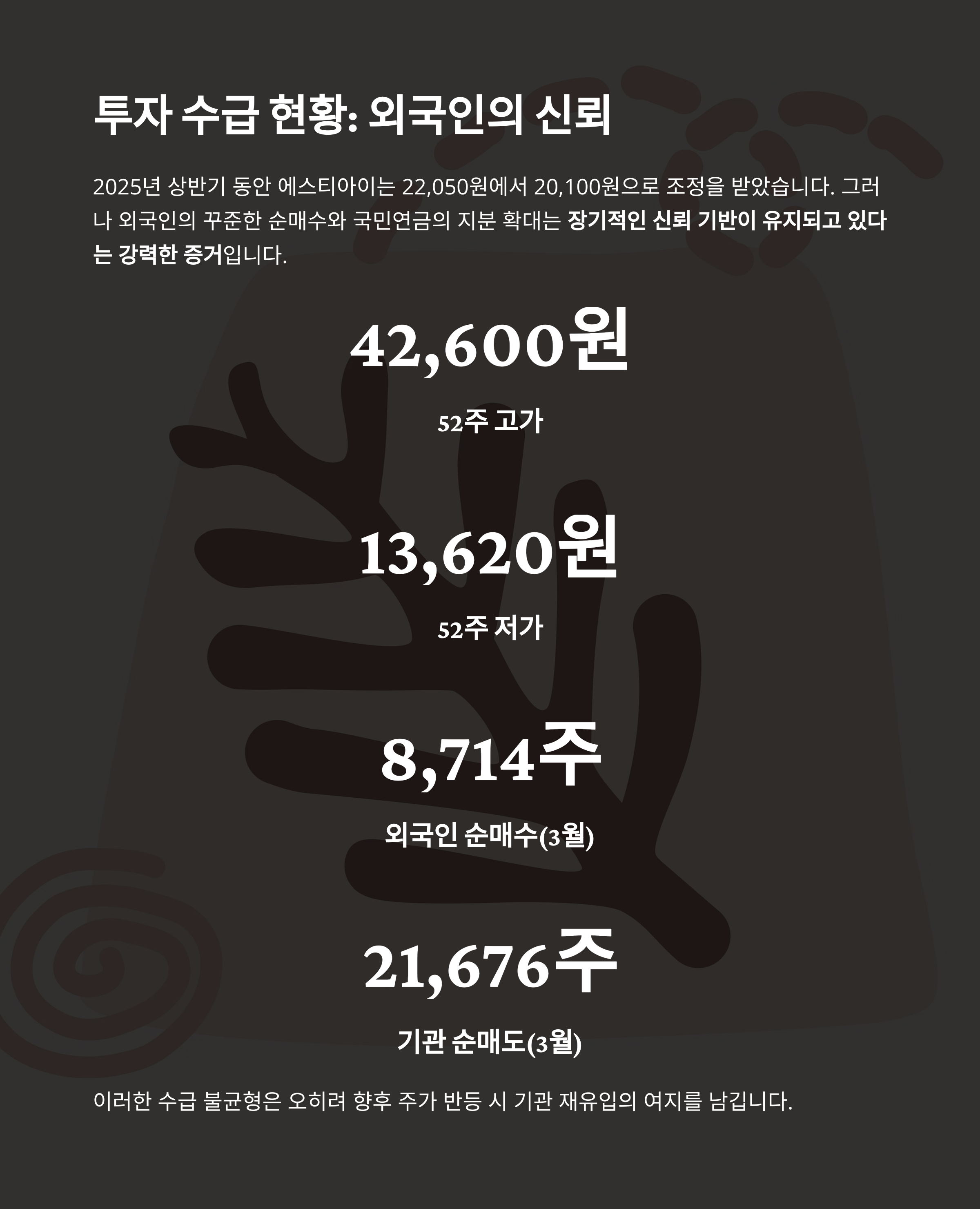 그러나 외국인의 꾸준한 순매수와 국민연금의 지분 확대는 장기적인 신뢰 기반이 유지되고 있다는 강력한 증거입니다.
