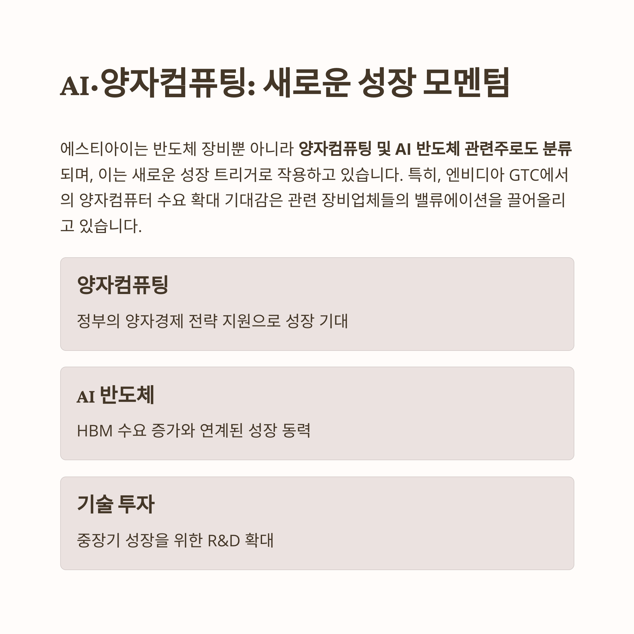 에스티아이는 반도체 장비뿐 아니라 양자컴퓨팅 및 AI 반도체 관련주로도 분류되며, 이는 새로운 성장 트리거로 작용하고 있습니다.