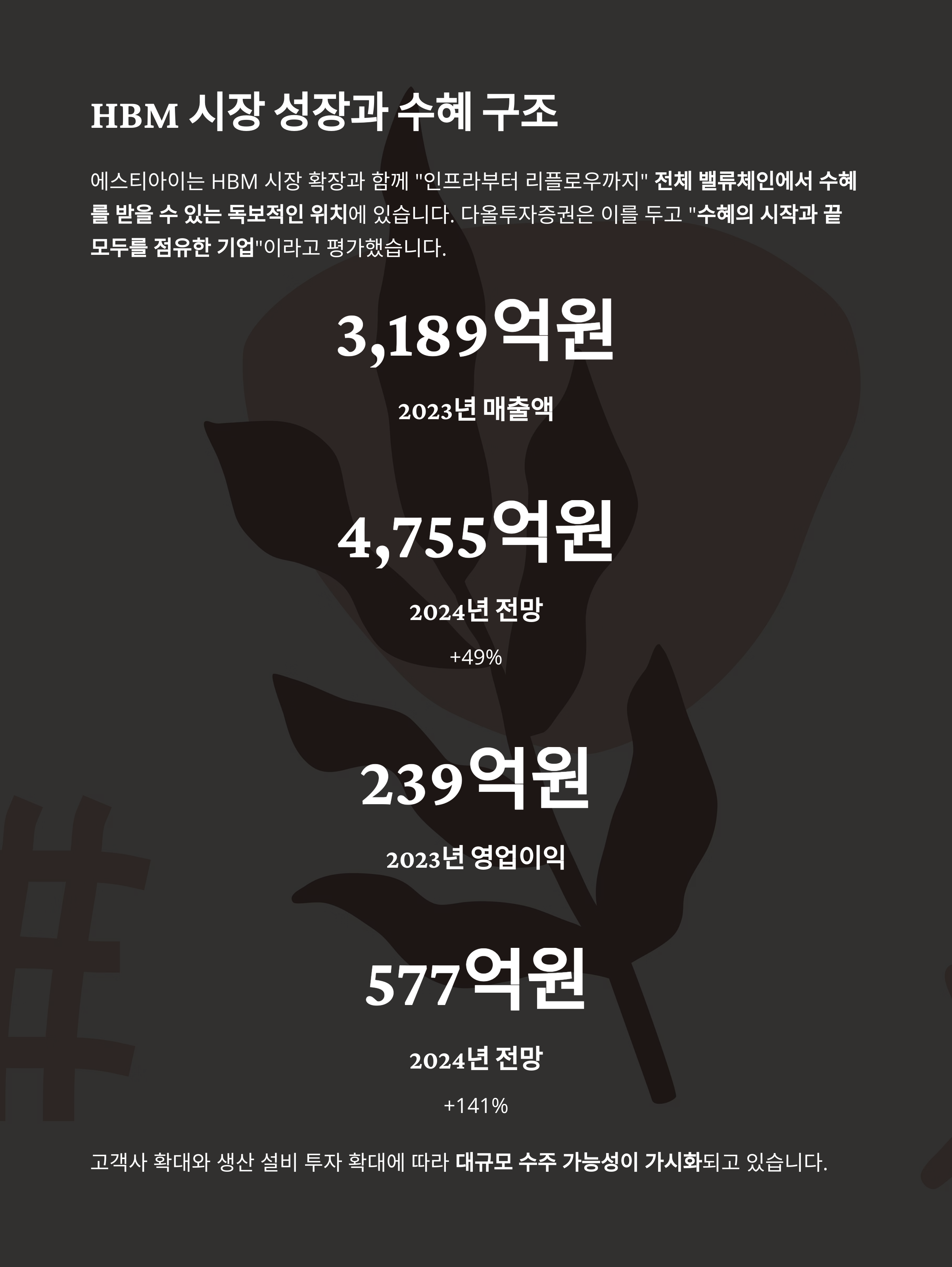 고객사 확대와 생산 설비 투자 확대에 따라 대규모 수주 가능성이 가시화되고 있으며, 이는 2024년 매출 증가(4,755억 원, +49%)와 영업이익 급증(577억 원, +141%)으로 이어질 전망입니다.