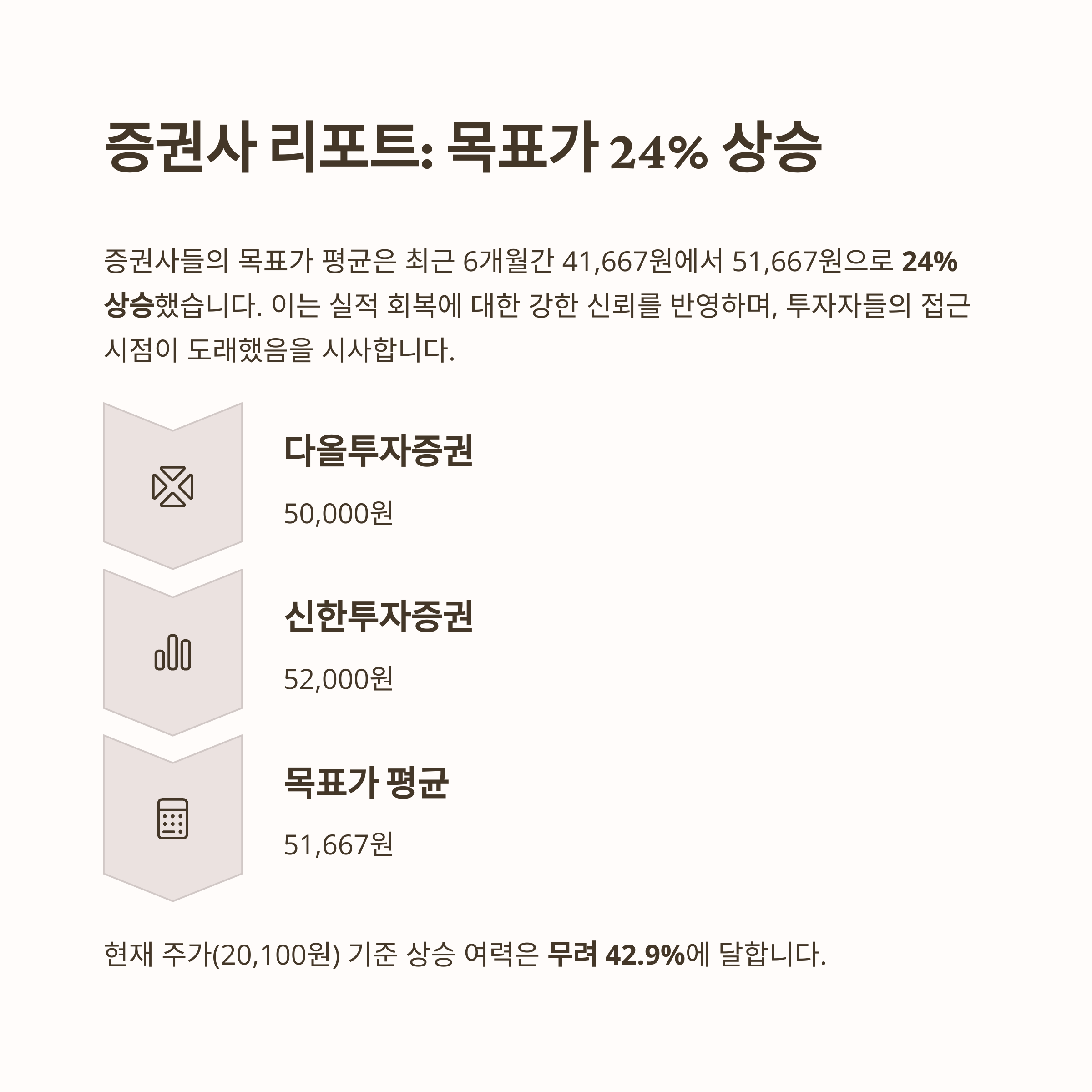 증권사들의 목표가 평균은 최근 6개월간 41,667원에서 51,667원으로 24% 상승했습니다.