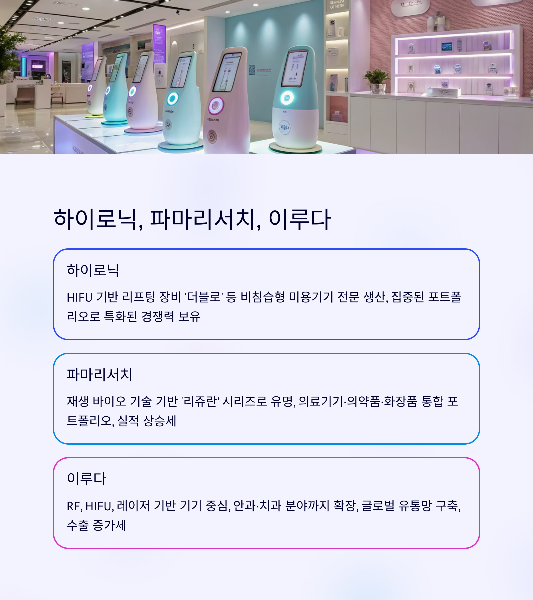 • 기술력: HIFU, RF, 피코레이저 등은 기업별로 차별화된 기술을 보유하고 있으며, 대부분 자사 기술 기반의 자체 생산 시스템을 갖추고 있습니다.