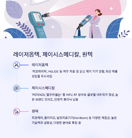 ‘피코레이저’, ‘HELIOS’ 등 피부 치료 및 문신 제거 기기에 강점을 가지고 있으며, 최근 몇 년간 매출 성장률이 눈에 띕니다.