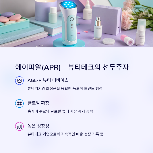 AGE-R 뷰티 디바이스와 화장품을 융합한 뷰티테크 기업으로, 뷰티기기 부문에서 독보적 브랜드를 형성하고 있습니다. 홈케어 수요와 글로벌 뷰티 시장 확장을 동시에 잡고 있어 성장성이 매우 높습니다.