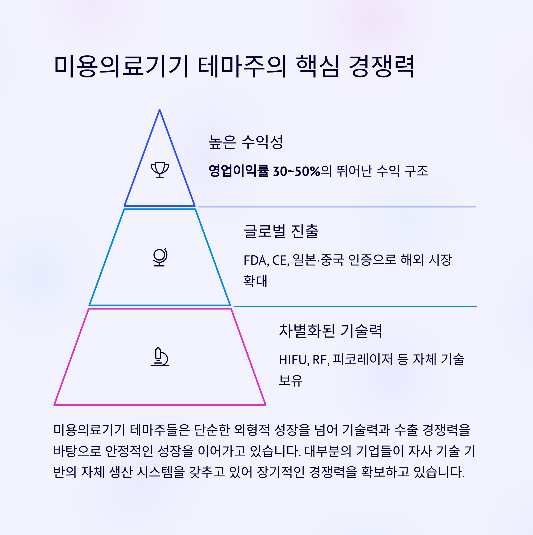 미용의료기기 테마주의 매력은 단지 외형적 성장뿐 아니라 높은 기술력과 수출 경쟁력에도 있습니다.