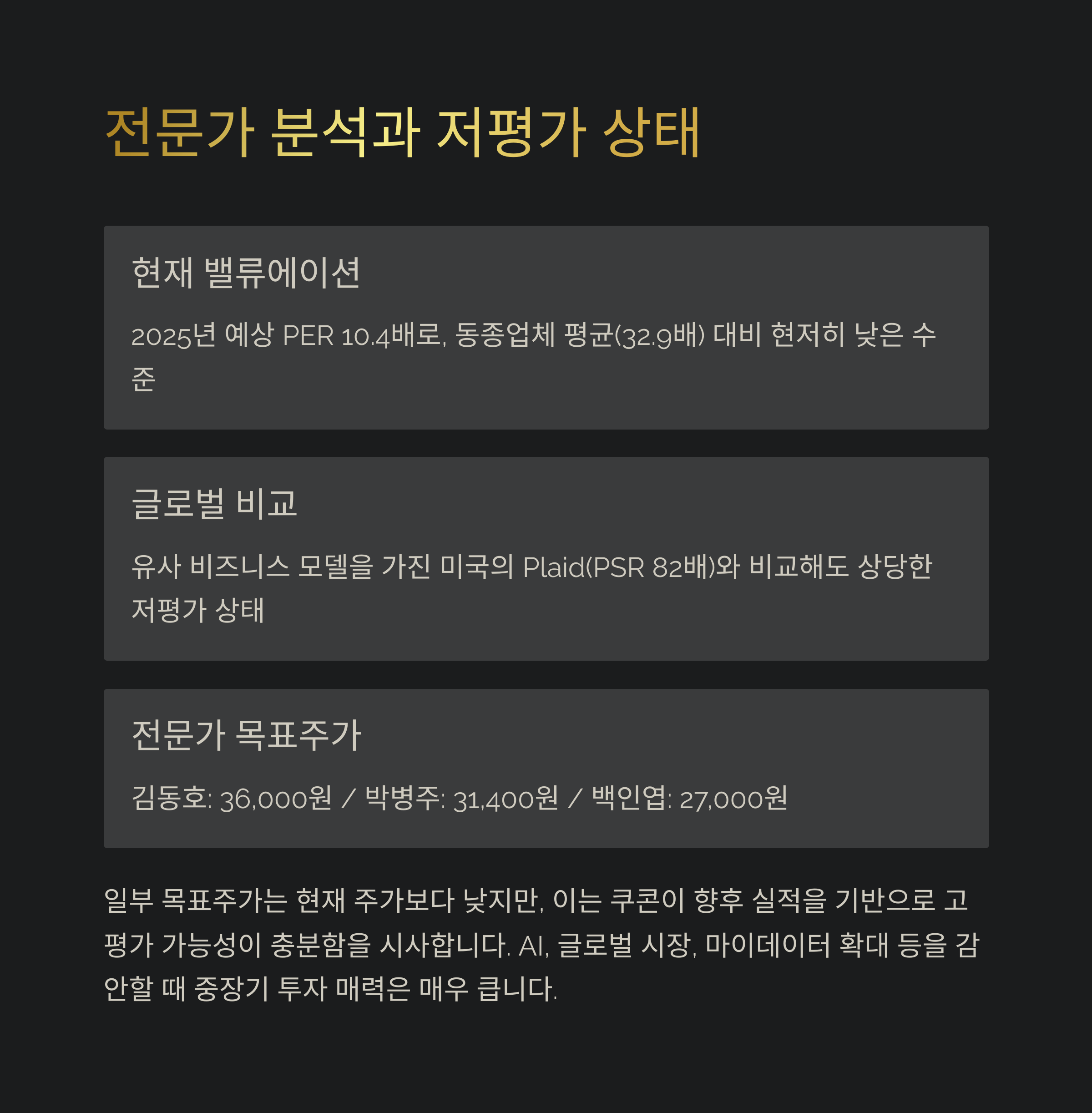 현재 쿠콘의 주가는 2025년 예상 PER 10.4배로, 동종업체 평균(32.9배) 대비 현저히 낮은 수준입니다. 유사 비즈니스 모델을 가진 미국의 Plaid(PSR 82배)와 비교해도 상당한 저평가 상태입니다.
