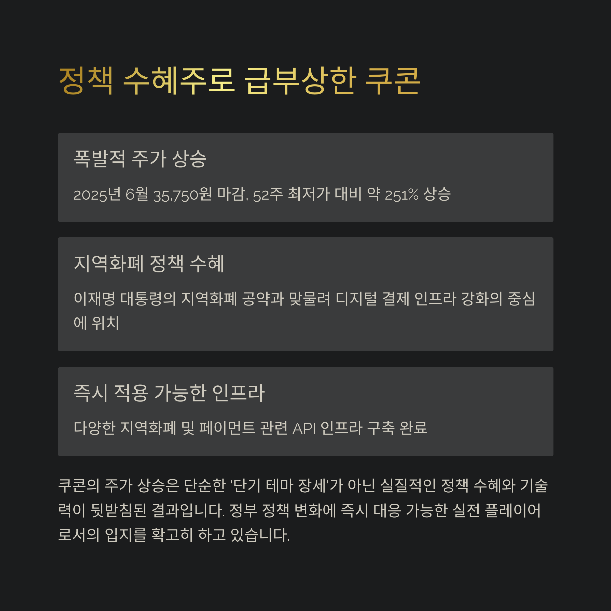 이재명 대통령의 지역화폐 공약과 맞물려 디지털 결제 인프라가 강화되면서, 쿠콘이 그 중심에 있다는 점이 가장 큰 상승 요인입니다. 쿠콘은 이미 다양한 지역화폐 및 페이먼트 관련 API 인프라를 구축해 둔 상태로, 정부 정책 변화에 따라 즉시 적용 가능한 실전 플레이어라는 평가를 받고 있습니다.