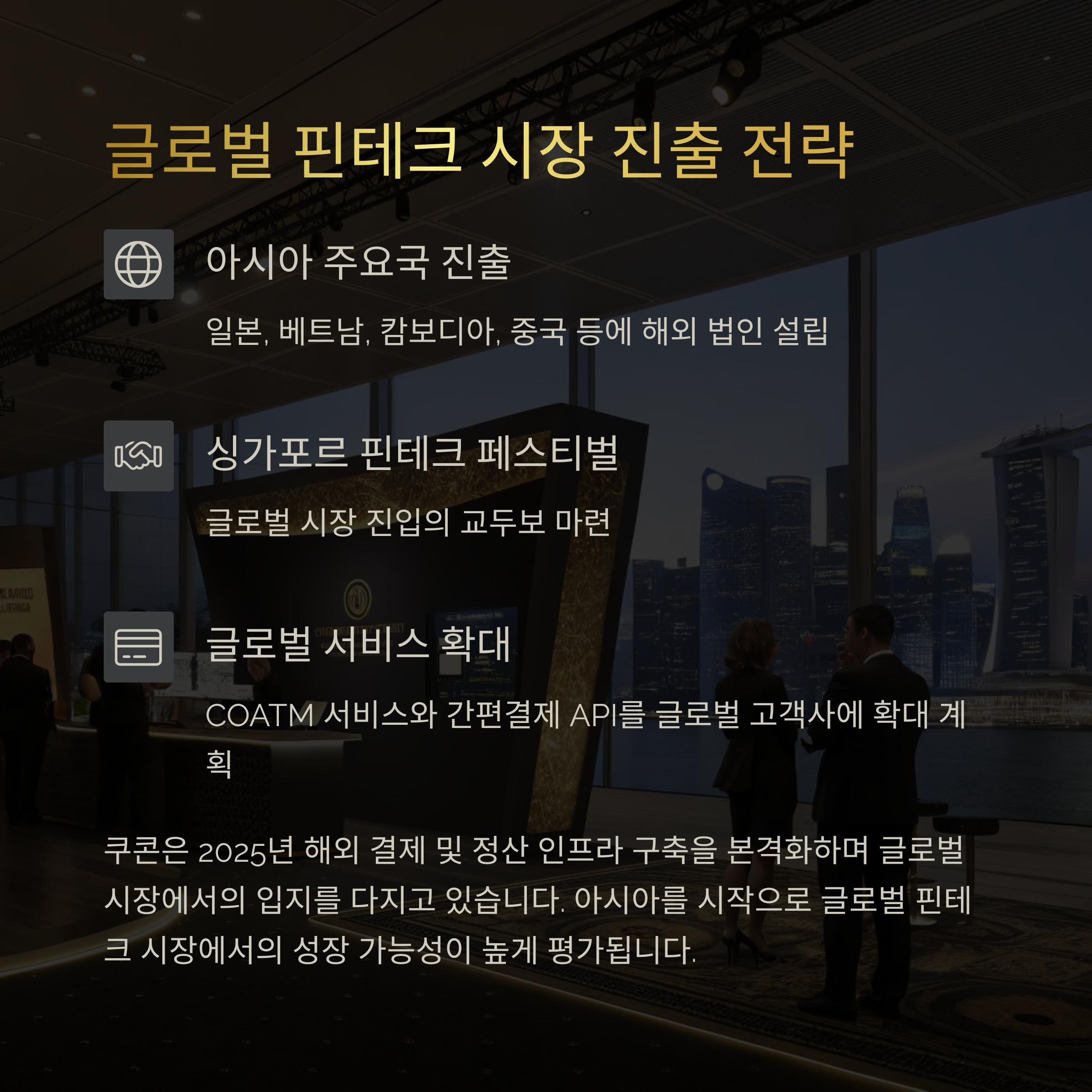 쿠콘은 일본, 베트남, 캄보디아, 중국 등 아시아 주요국에 해외 법인을 두고 있으며, 2025년 해외 결제 및 정산 인프라 구축을 본격화하고 있습니다. 특히 싱가포르 핀테크 페스티벌 참가를 통해 글로벌 시장 진입의 교두보를 마련했고, COATM 서비스와 간편결제 API를 글로벌 고객사에 확대할 계획입니다.