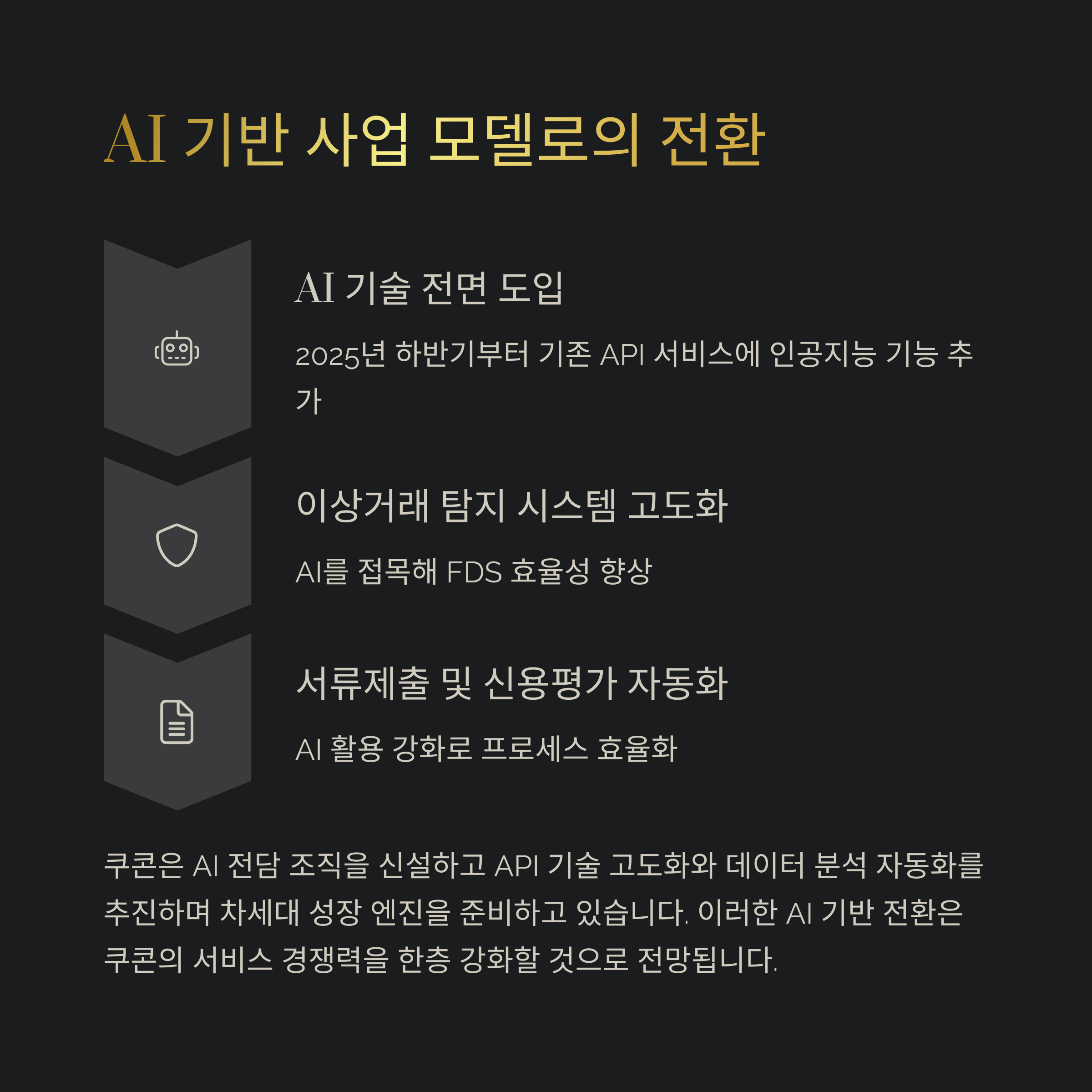 AI 전담 조직 신설, API 기술 고도화, 데이터 분석 자동화는 쿠콘의 차세대 성장 엔진으로 주목받고 있습니다.
